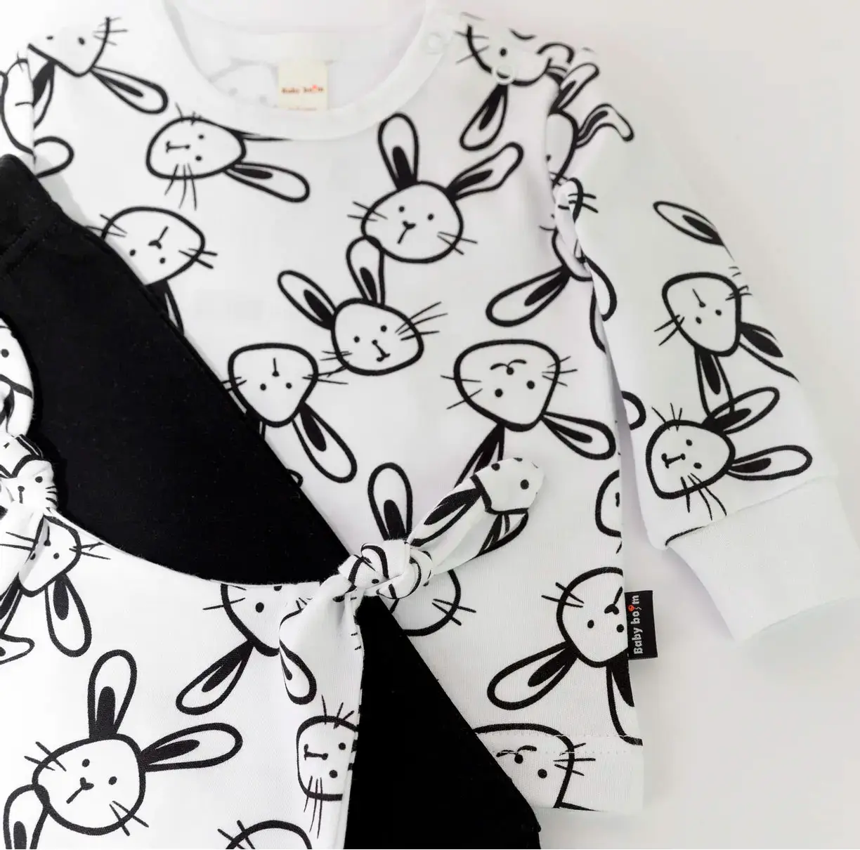 Детский комплект от бренда Baby boom выполнен из 100% хлопка – интрелок. Материал не вызывает аллергических реакций и хорошо пропускает воздух, позволяя коже ребёнка дышать. Лонгслив с кнопками по плечу и шапочка с ушками-узелками выполнены из принтованного интерлока, брючки на манжетах из чёрного интерлока.