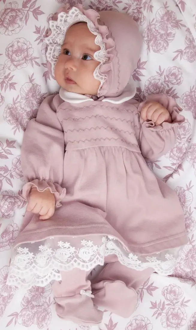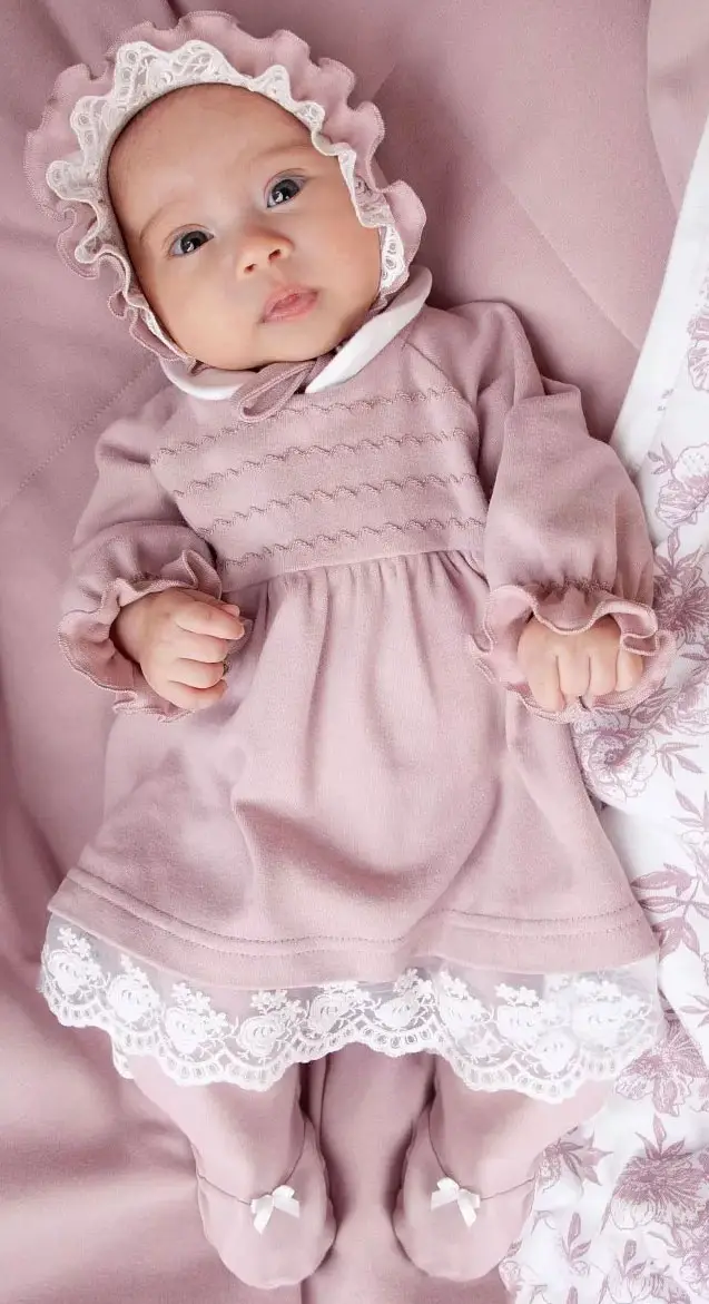 Комплект для девочек от бренда "Наследник Выжанова" включает платье с длиным рукавом и закрытым носочком, а также чепчик. Они украшены отделкой из кружева. Одежда изготовлена из 100% хлопка и подходит для тёплой весны и лета.