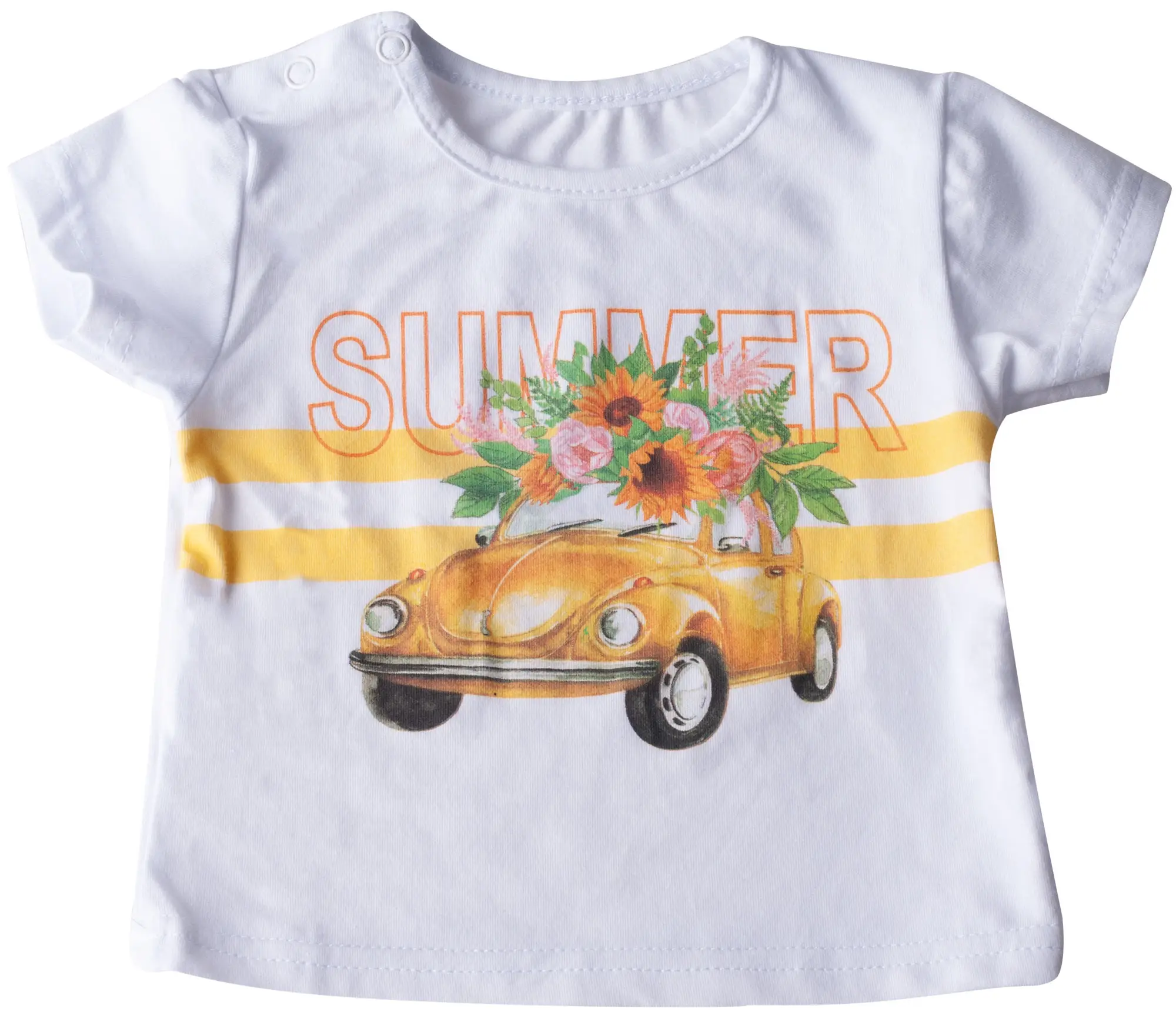 Трикотажная футболка для девочки имеет плечевые застёжки-кнопочки для удобства одевания малыша. Изделие украшено ярким принтом. Кофта отличн...