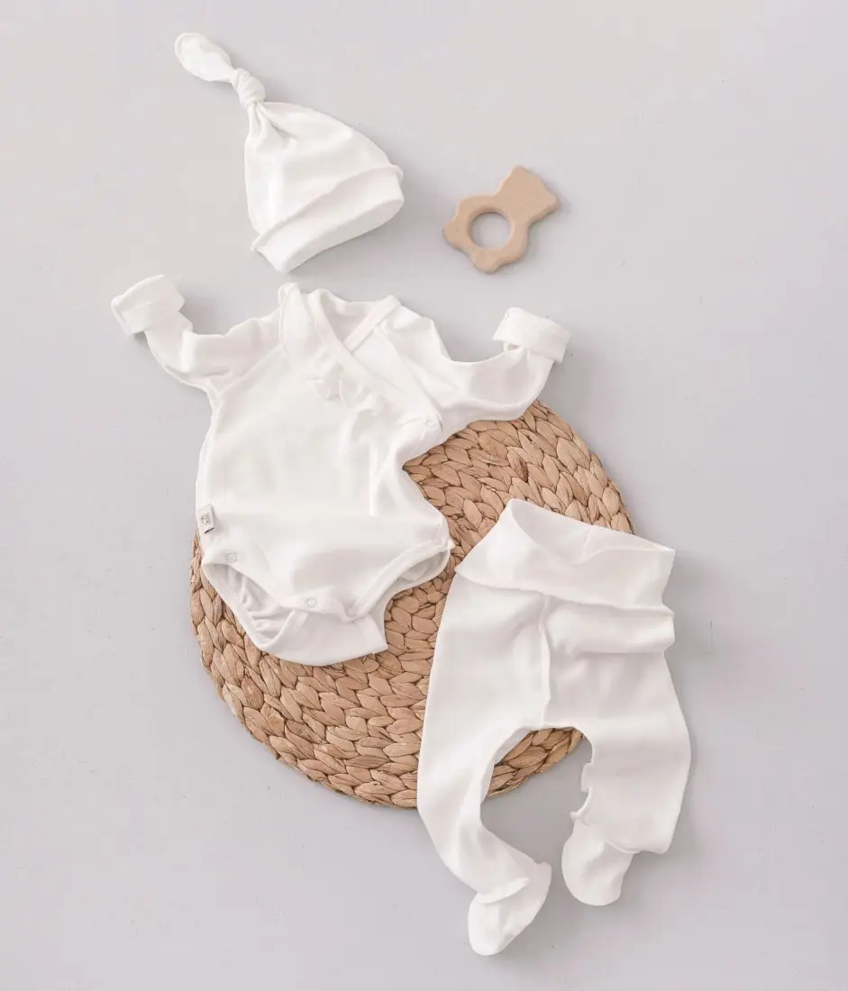 Комплект из 3-х предметов – боди на кнопках из интерлока дополнен шапочкой и штанишками. Такой комплект отлично подойдёт для повседневной носки и будет великолепно смотреться на вашем малыше.