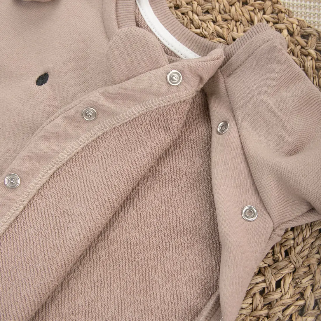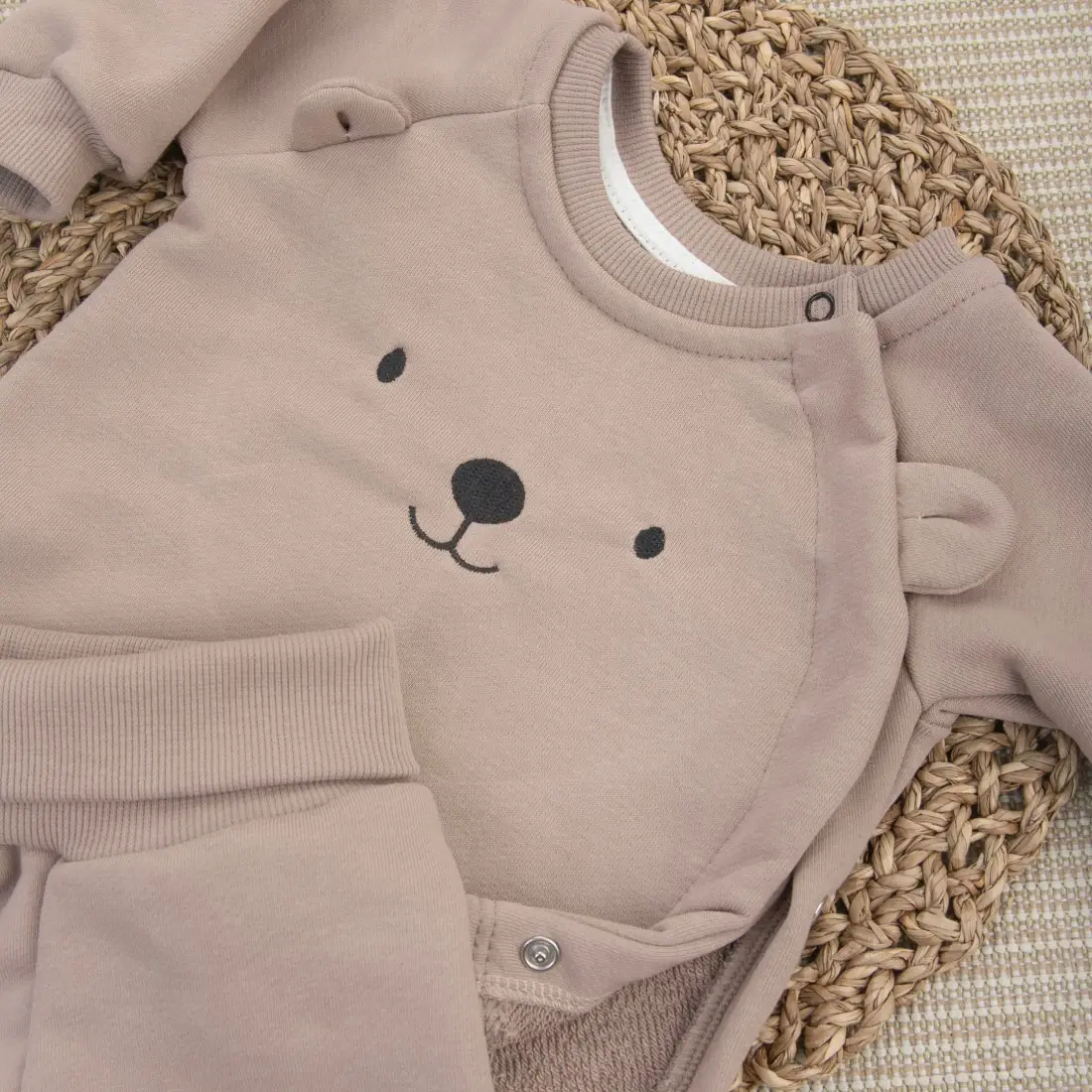В комплект "Пикколино Лайт" KiDi kids входят свитшот, штаны и боди. Свитшот украшен вышивкой с мордочкой медвежонка на груди и имеет кнопки по бокам для удобства одевания, что позволит легко одеть и раздеть малыша, также на рукавах предусмотрены регулируемые манжеты. Штаны оснащены с широкой регулируемой резинкой на талии и штанинах. Боди оснащено застежками-кнопками снизу для удобной смены подгузника. Рукав без швов в области подмышек предотвращает натирание.