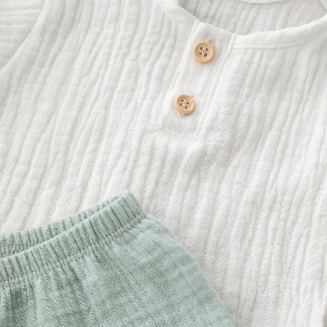 Летний комплект рубашка и шорты от бренда KiDi kids выполнен из муслина, структура которого образует воздушные канала, за счёт чего кожа малыша будет дышать, в состав входит 100% хлопок.