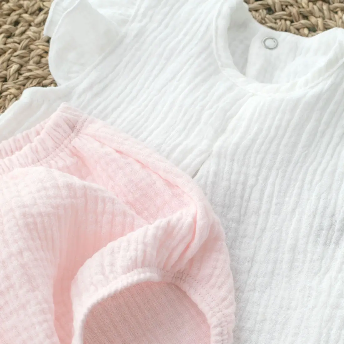 Летний комплект топ и трусики от бренда KiDi kids выполнен из муслина, структура которого образует воздушные канала, за счёт чего кожа малыша будет дышать, в состав входит 100% хлопок.
