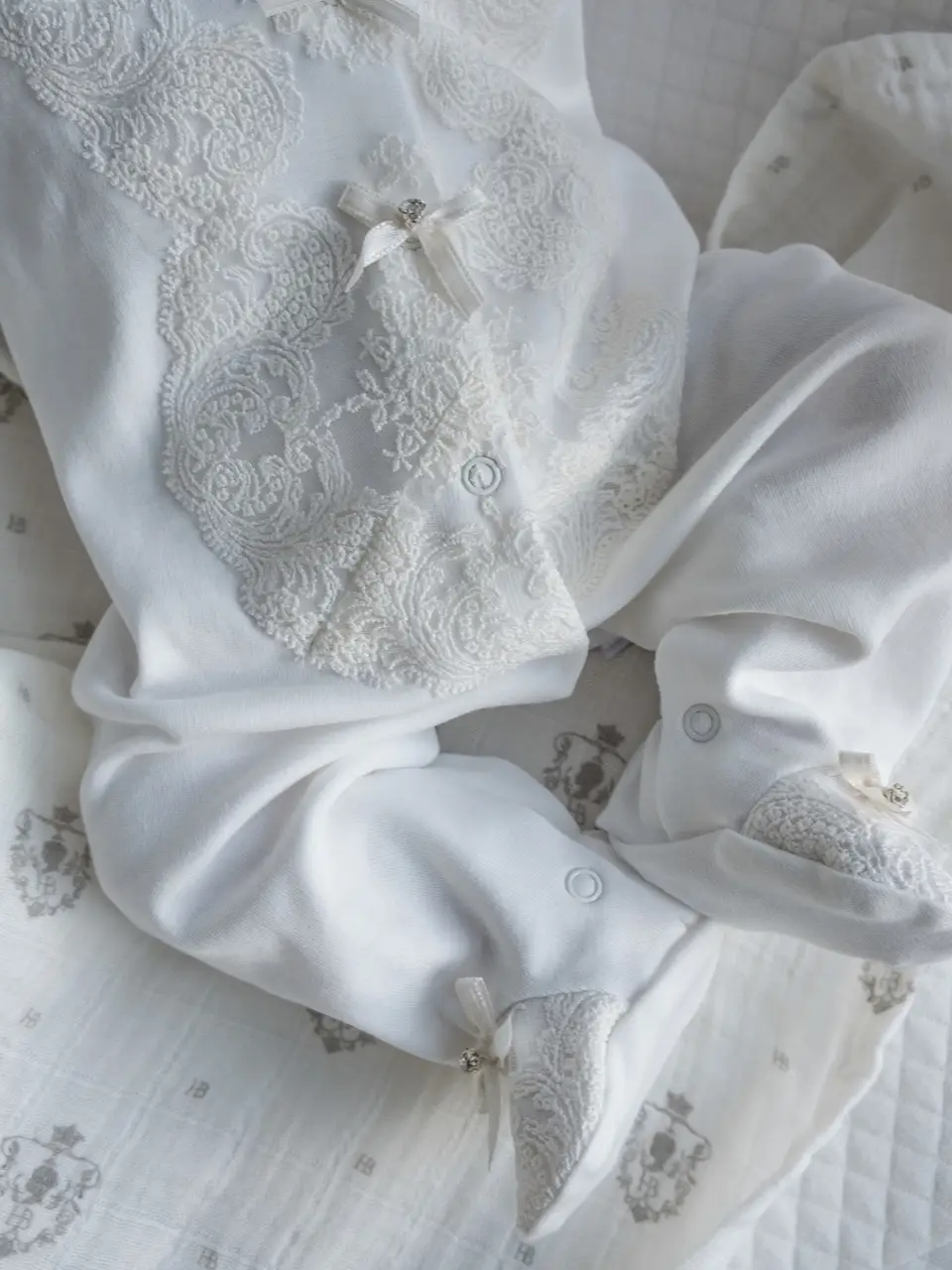 Комбинезон свободного кроя с кружевной юбочкой, застёгивается от воротничка до ножек на застёжки-кнопки. Спереди украшен необыкновенно краси...