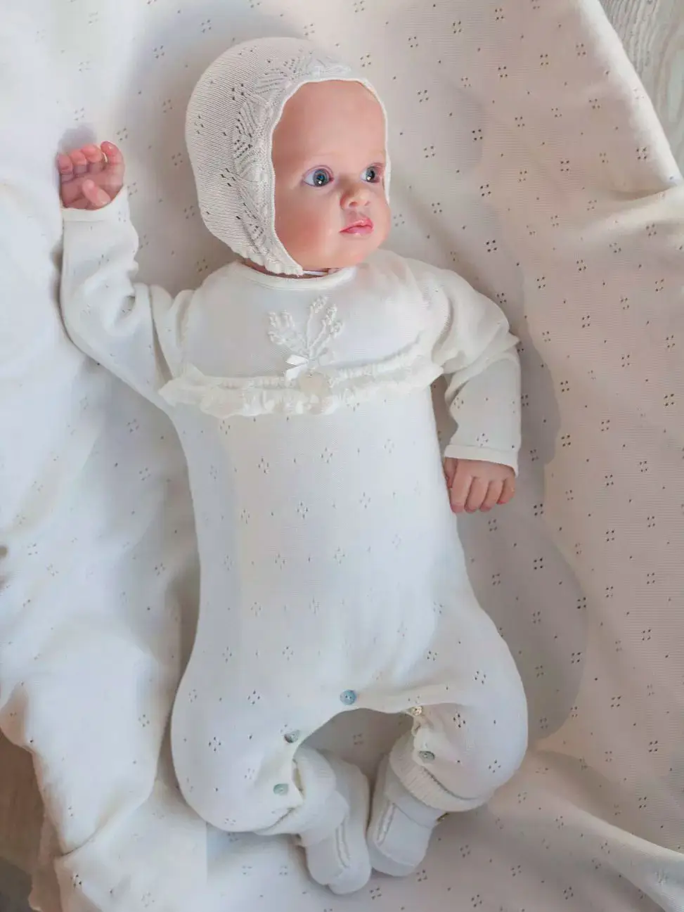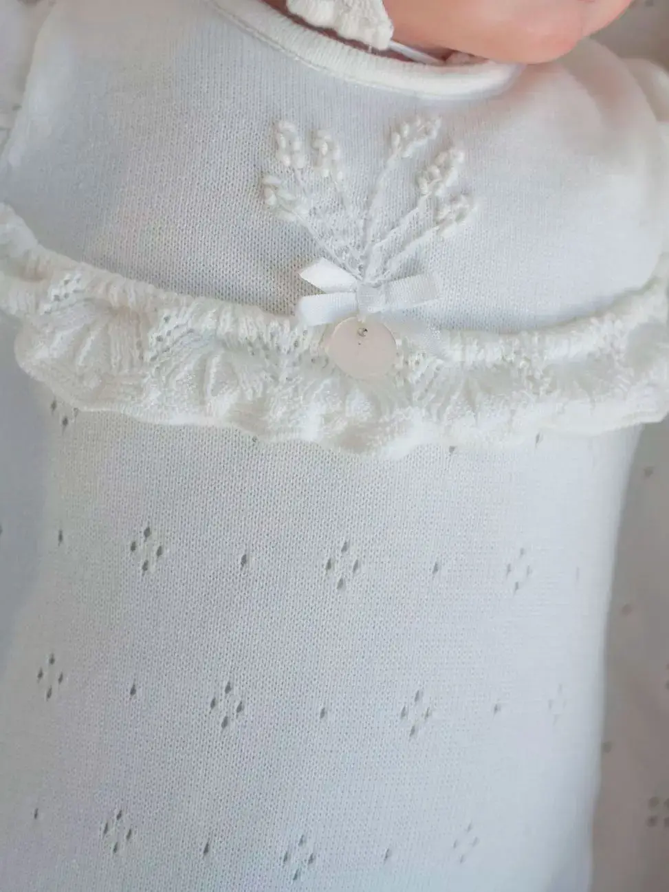 Комбинезон свободного кроя, застёгивается от воротничка до ножек на застёжки-кнопки. Спереди украшен необыкновенно красивой кружевной вставочкой.
