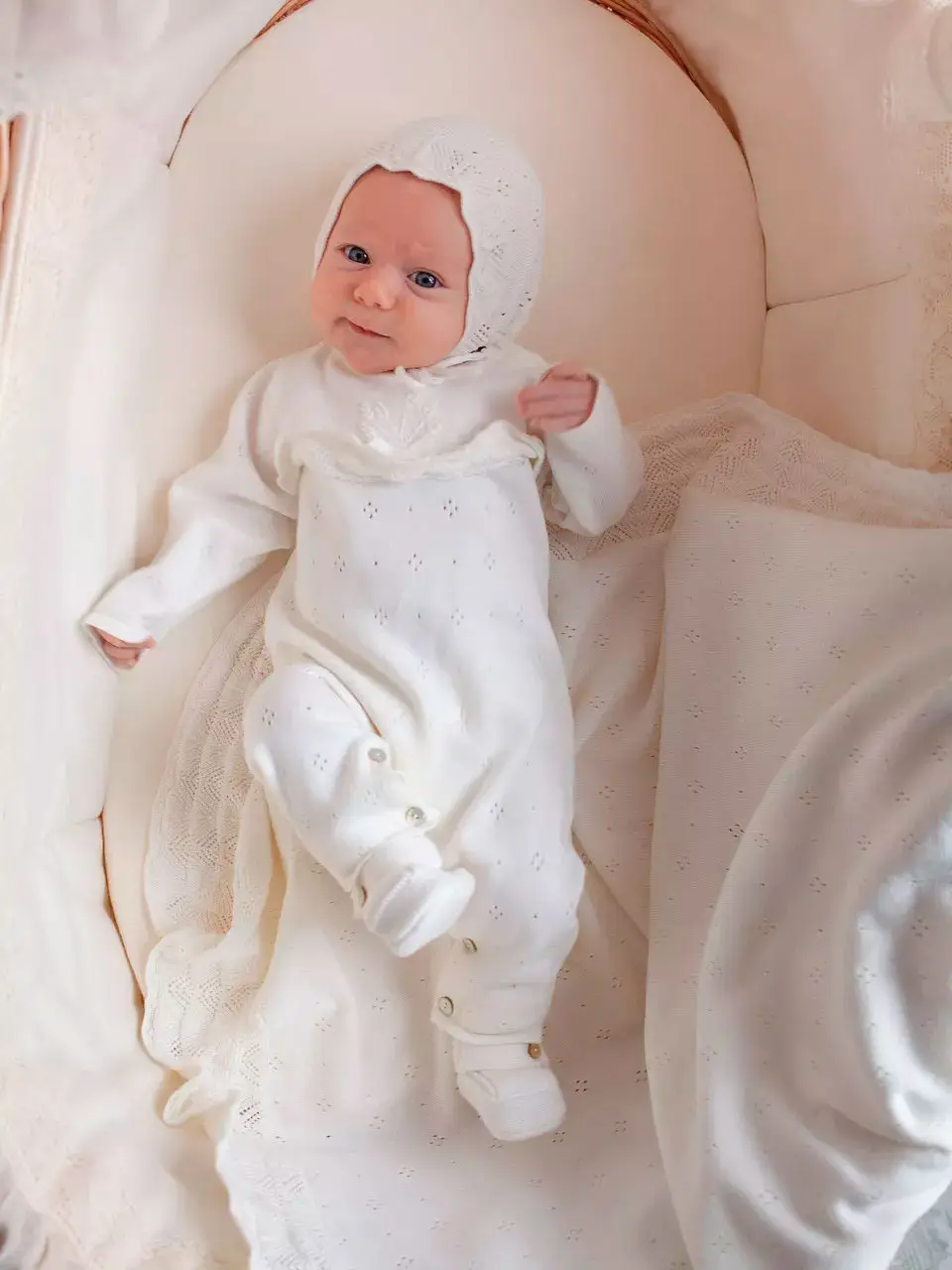 Комбинезон из 100% хлопка, застегивается от воротничка до ножек на удобные застежки-кнопки.