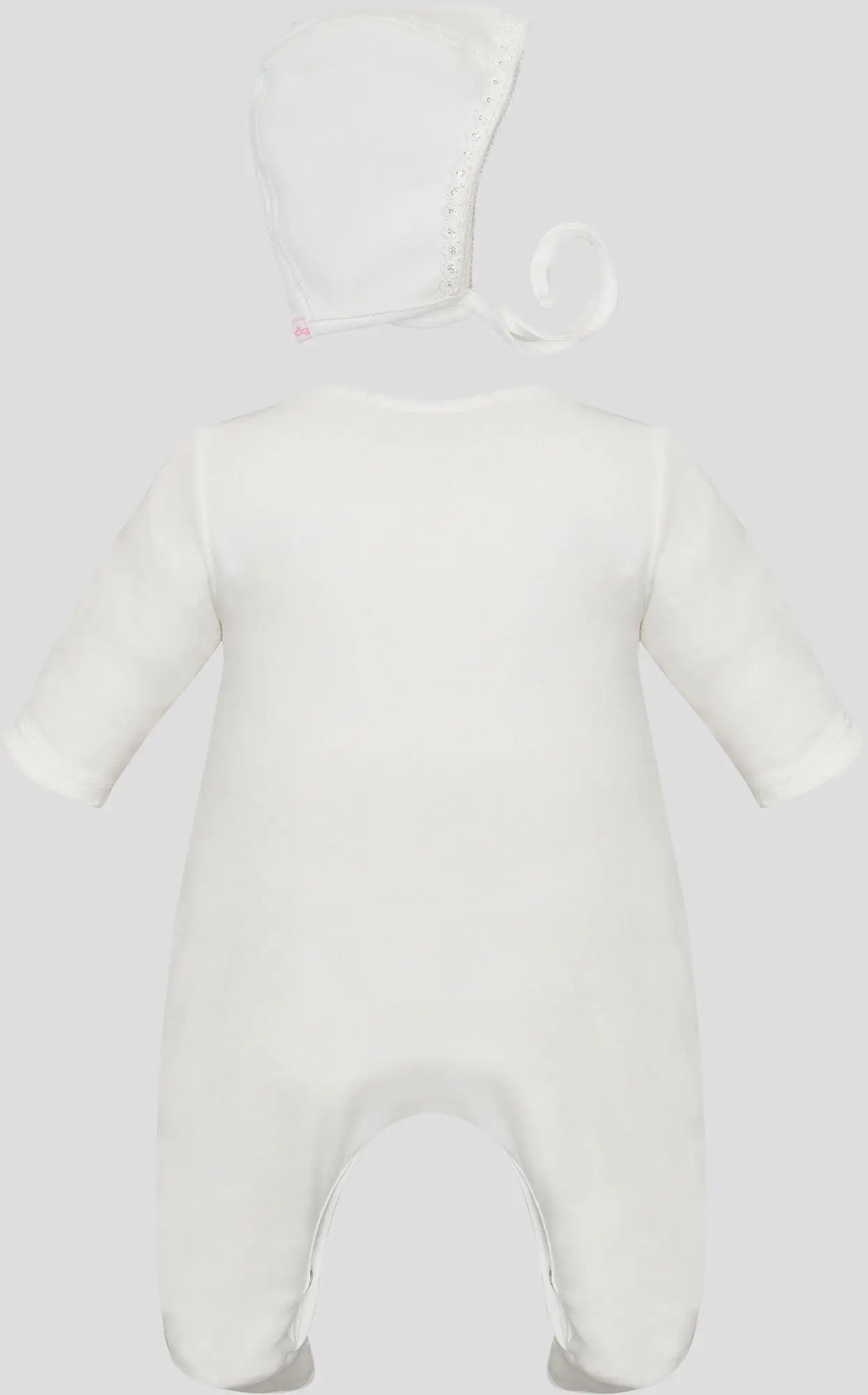 Нарядный комплект для девочки в белоснежном цвете – комбинезон и чепчик, украшен цветами. Нежнейшая ткань, искусно украшенная аппликациями ...