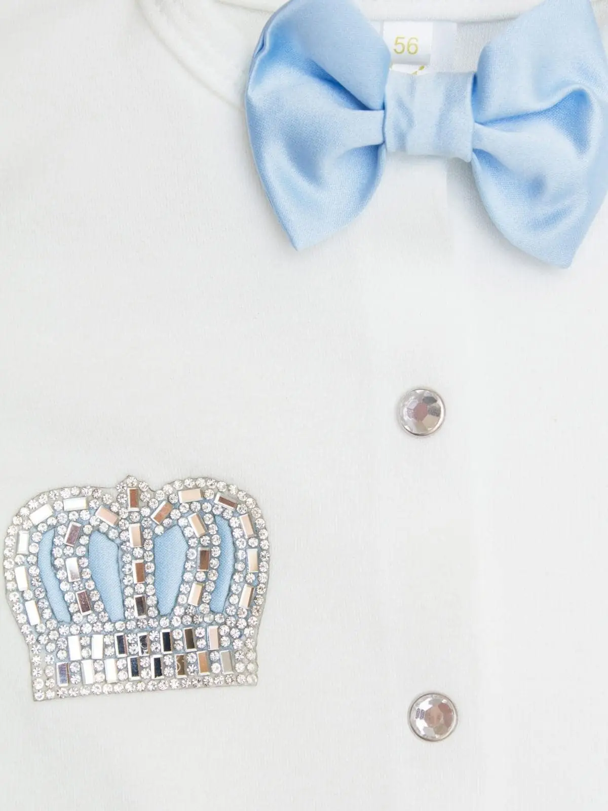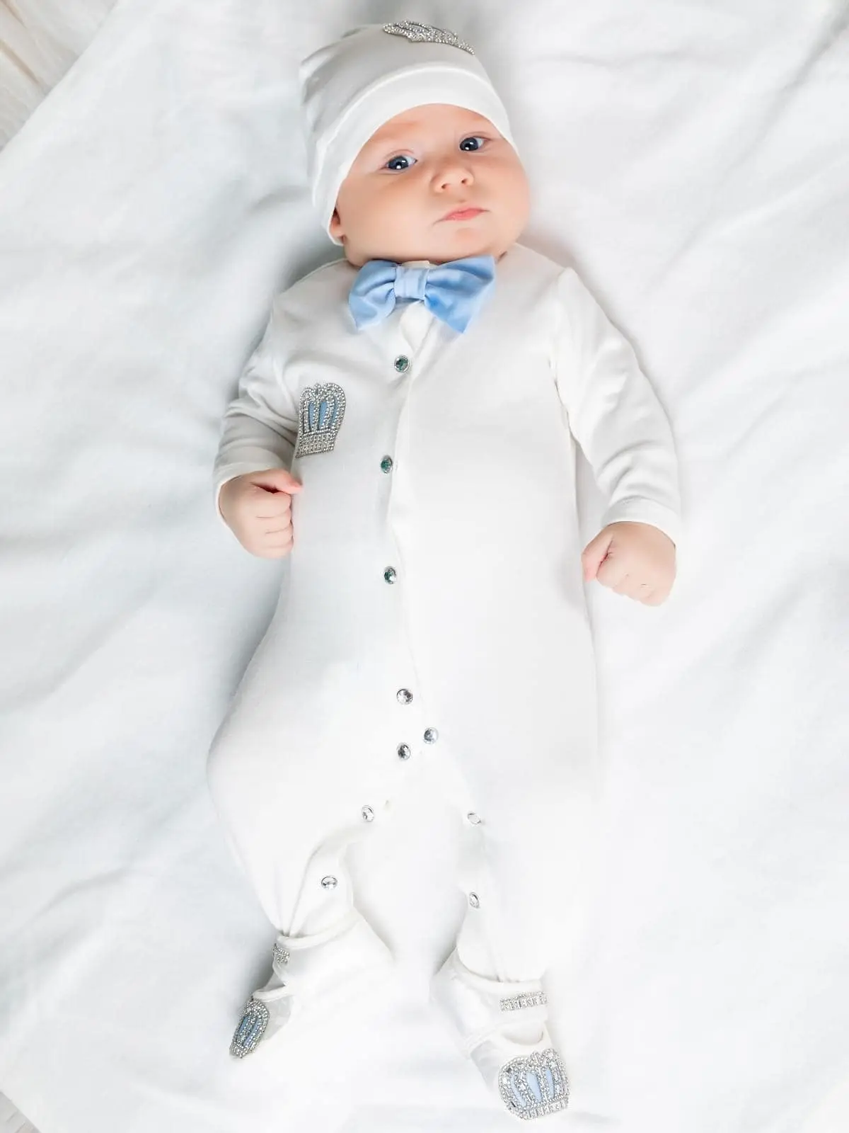 Эта модель создана специально для маленького принца. В комплекте комбинезон и шапочка – всё выполнено из интерлока пенье – трикотаж 100% хлопок самого лучшего качества. Корона из страз блестит и переливается, дополняют шикарный образ бантики ручной работы. С таким комплектом фото с выписки или крестин будут просто потрясающими.