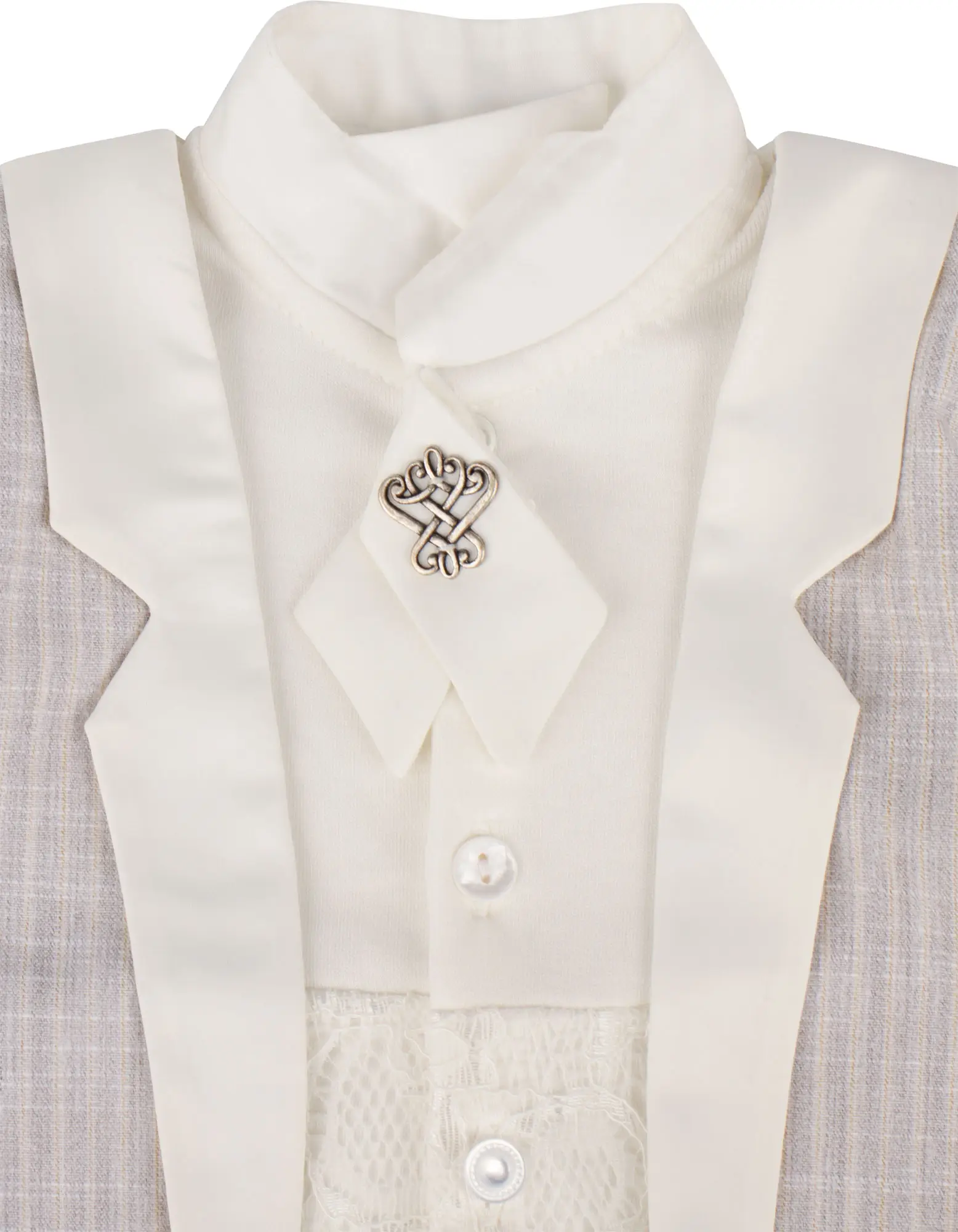 Элегантный комбинезон с декоративным жилетом, ажурной вставкой на поясе и оригинальным галстуком с металлическим декором сделают выписку ярк...