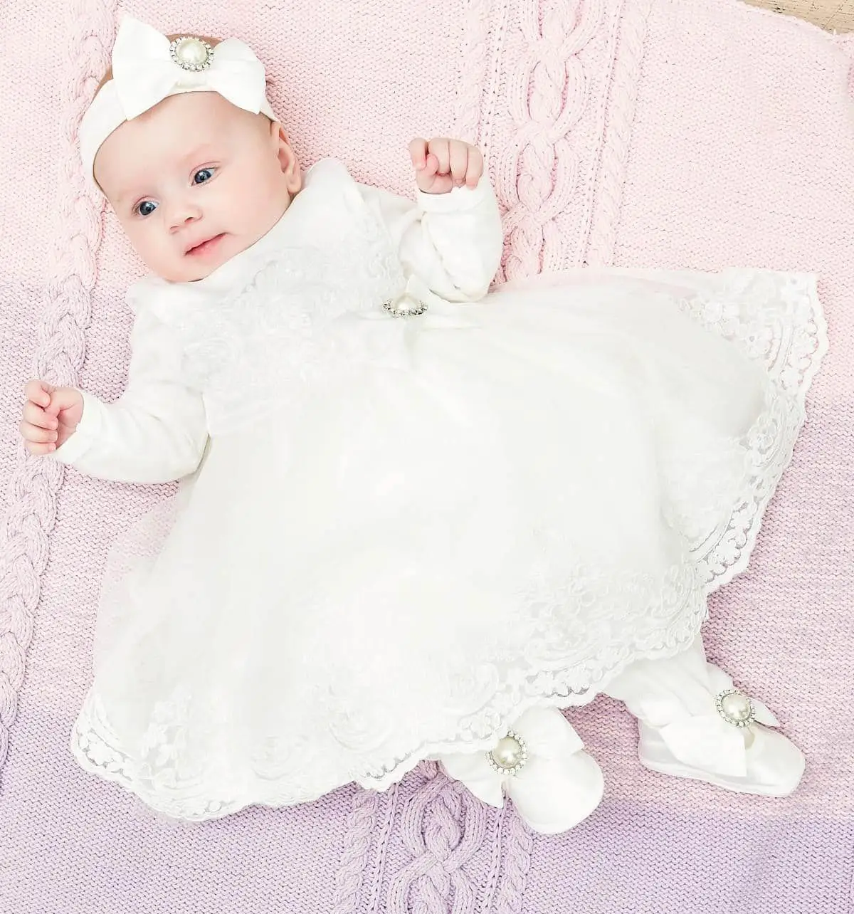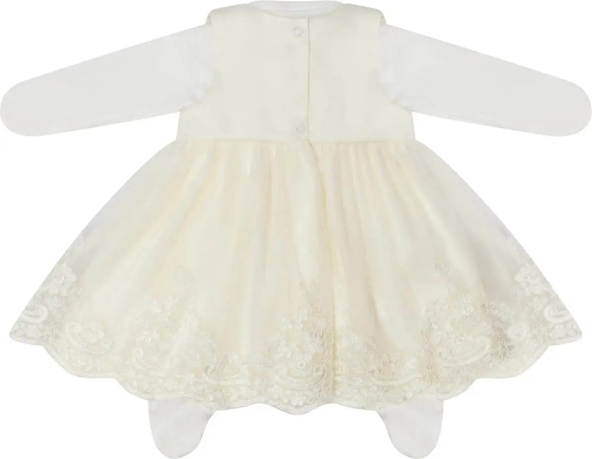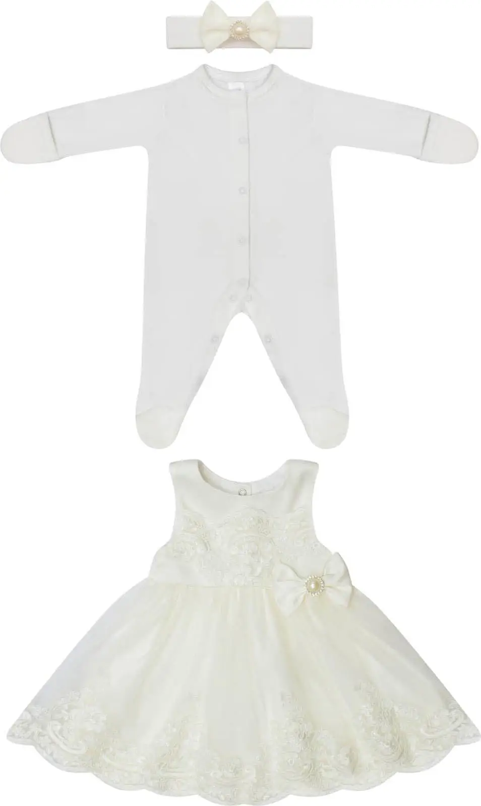 Набор включает комбинезон, повязку и платье для самых очаровательных принцесс. Комбинезон изготовлен из высококачественного стопроцентного хлопка, который мягкий и приятный на ощупь. Лиф и юбка платья украшены изысканными кружевами итальянского производства. У платья пышная верхняя юбка. Фотографии в таком наряде будут превосходными.