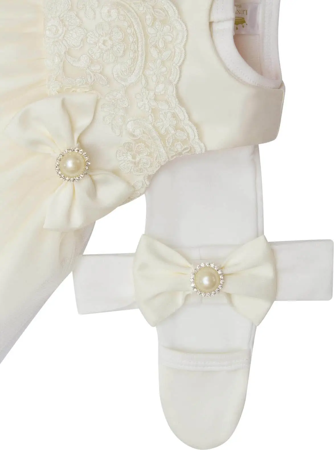 Комплект на выписку Luxury Baby Бусинка, 3 предмета, молочное с молочным кружевом, айвори, р. 62