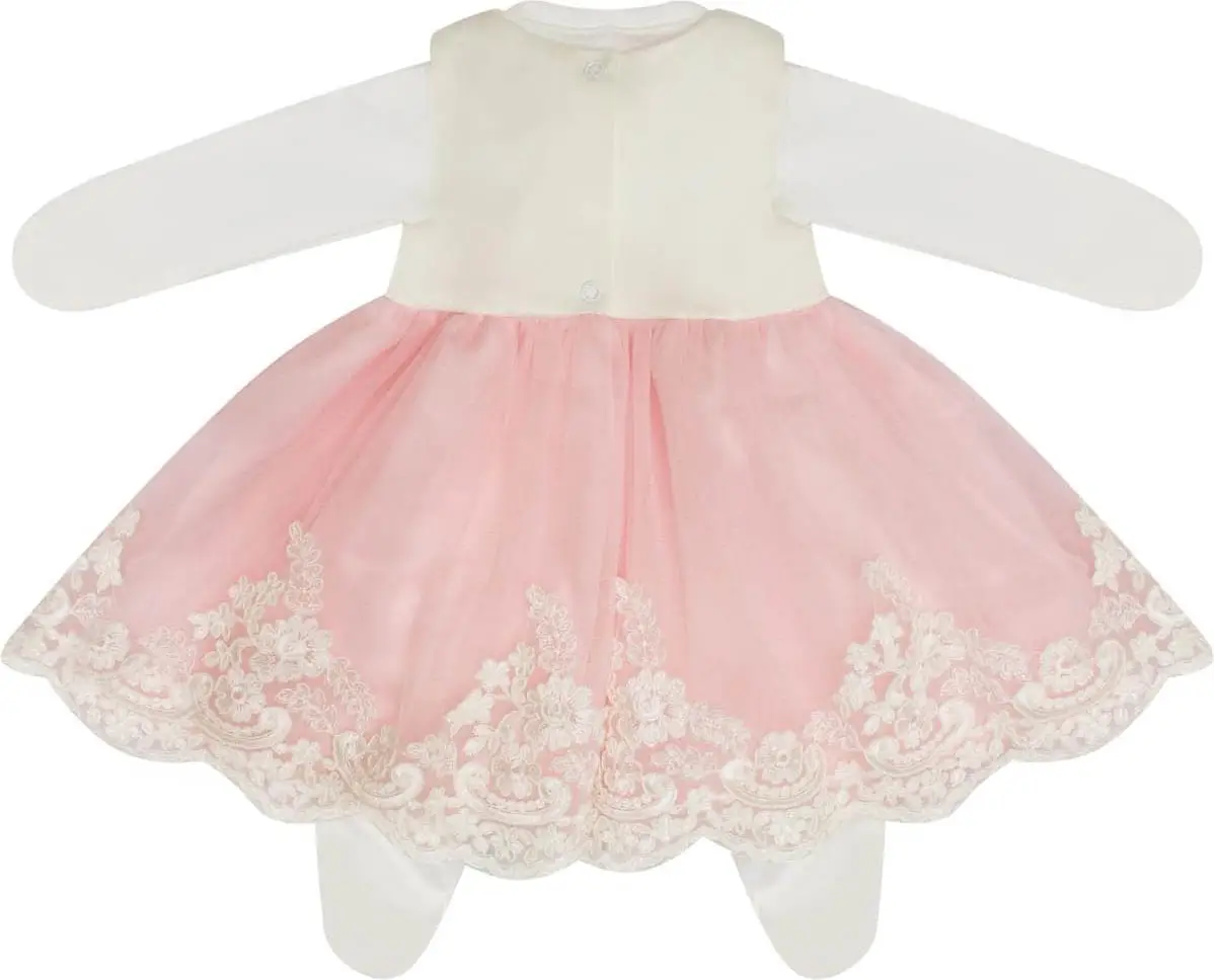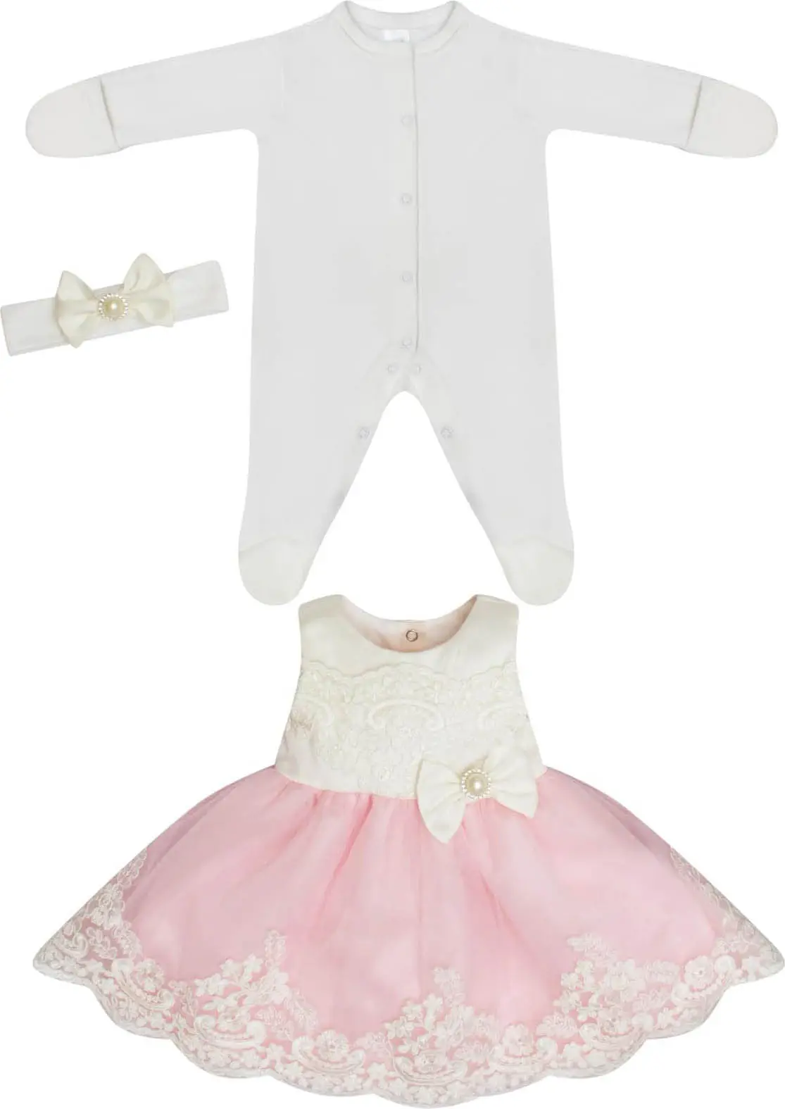 Набор включает комбинезон, повязку и платье для самых очаровательных принцесс. Комбинезон выполнен из стопроцентного хлопка, мягкого и приятного на ощупь. Лиф и юбка платья украшены изящными кружевами. У платья пышная верхняя юбка. Фотографии с выписки или крестин в таком наряде получатся превосходными.