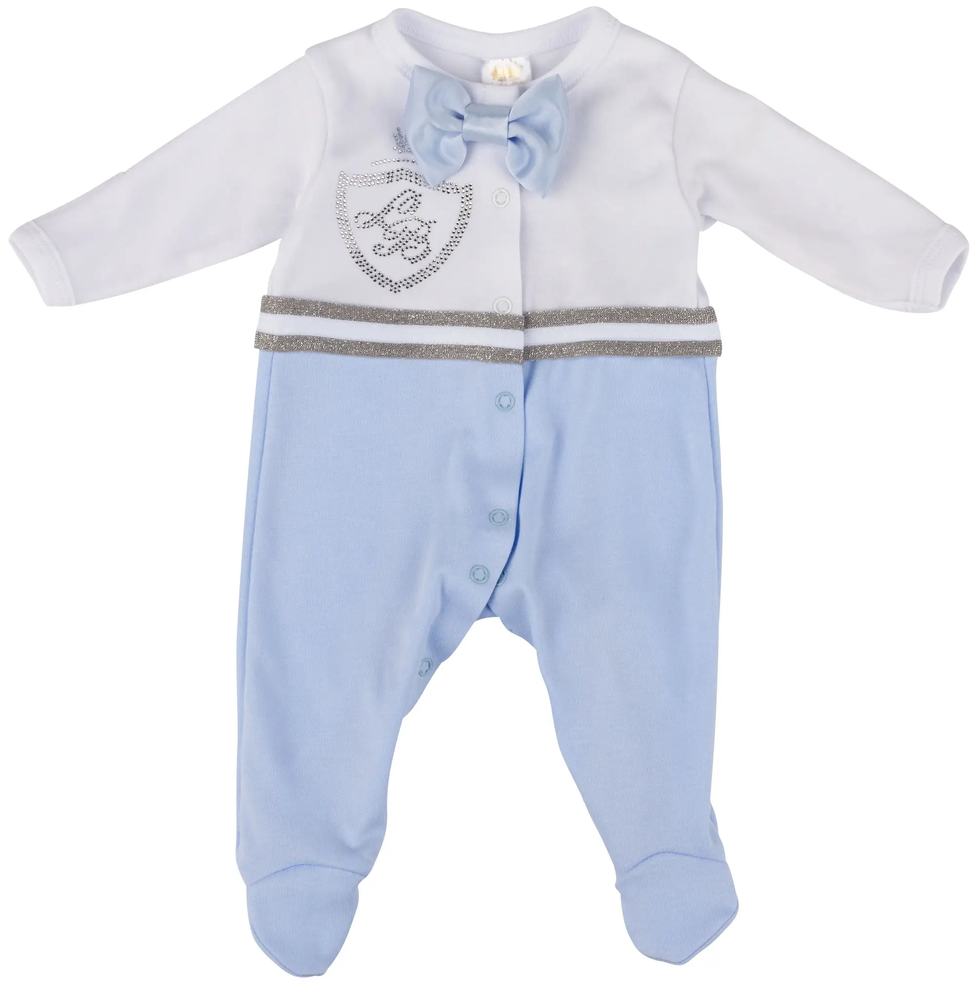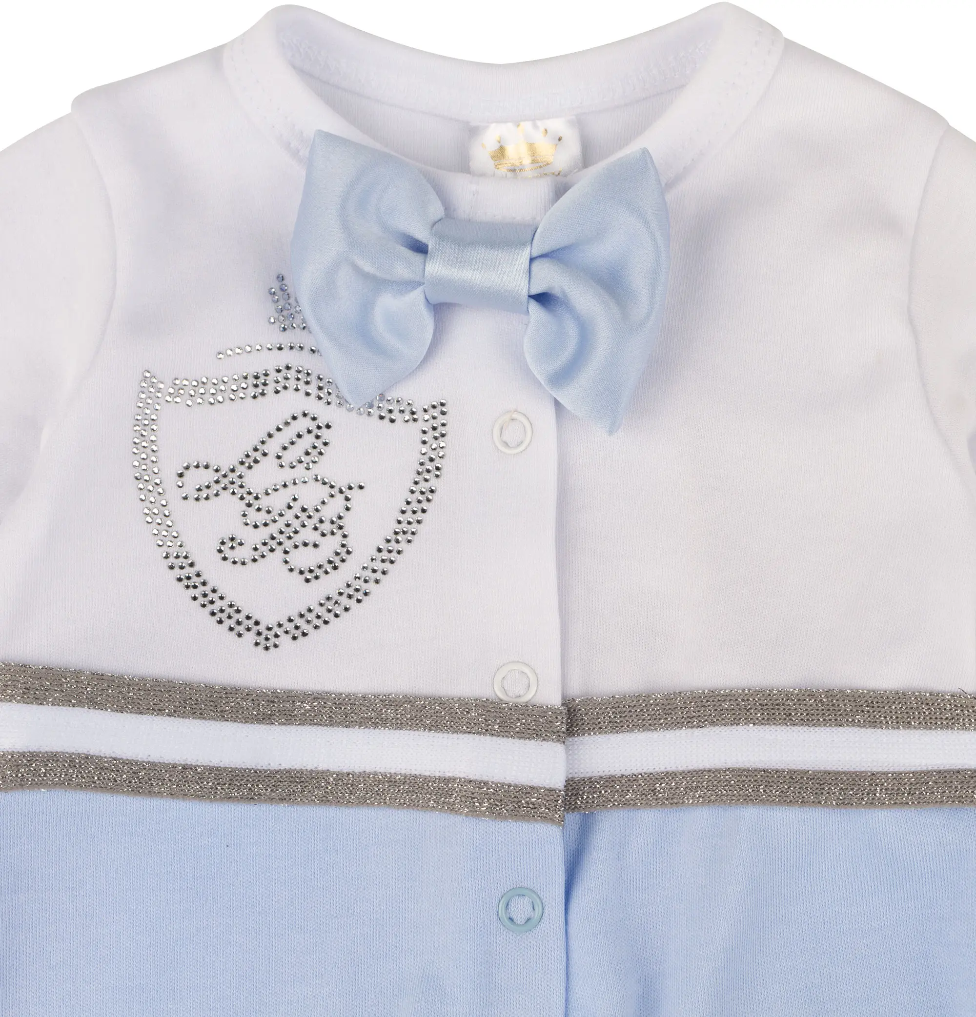 Комбинезон и чепчик изготовлены из трикотажа высшего качества, 100% хлопка, декорированные аппликацией из страз, отделкой ввиде резинки. Застёгивается комбинезон спереди, что облегчает родителям процесс надевания и снимания. Такой комплект будет удобен и комфортен в различных видах деятельности вашего малыша – в нём он будет великолепен!