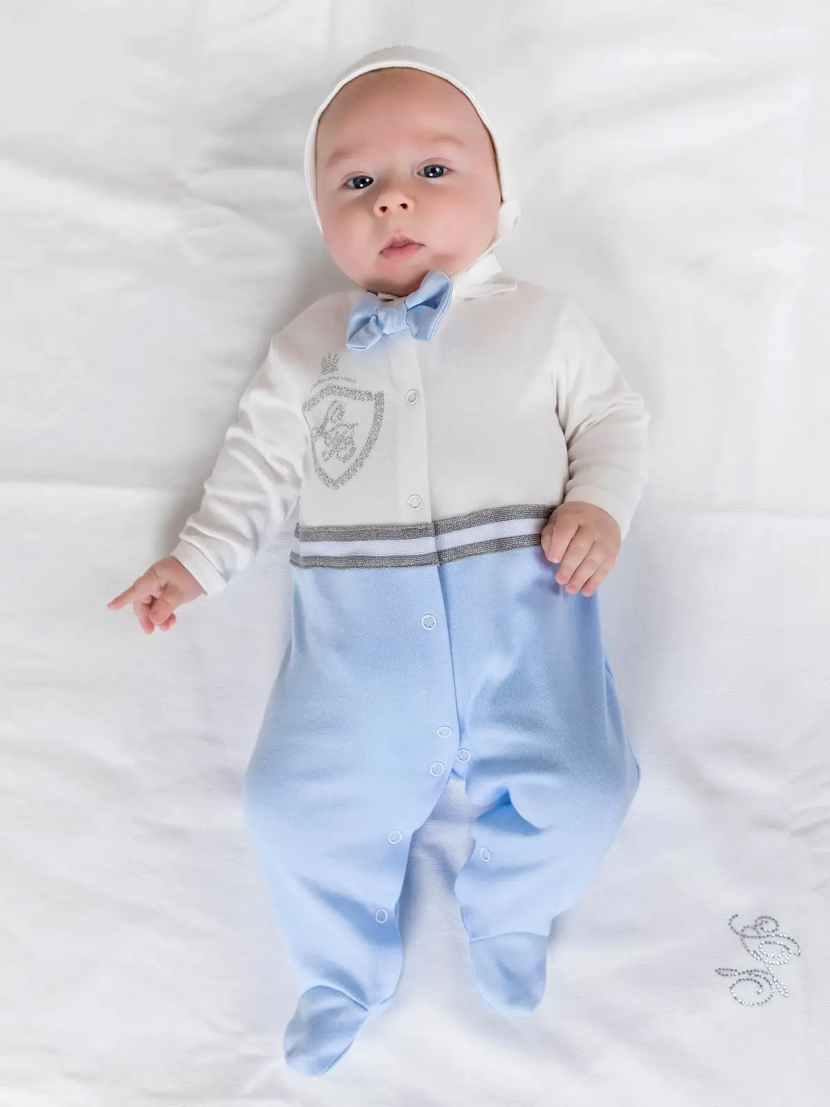 Комбинезон и чепчик изготовлены из трикотажа высшего качества, 100% хлопка, декорированные аппликацией из страз, отделкой ввиде резинки....