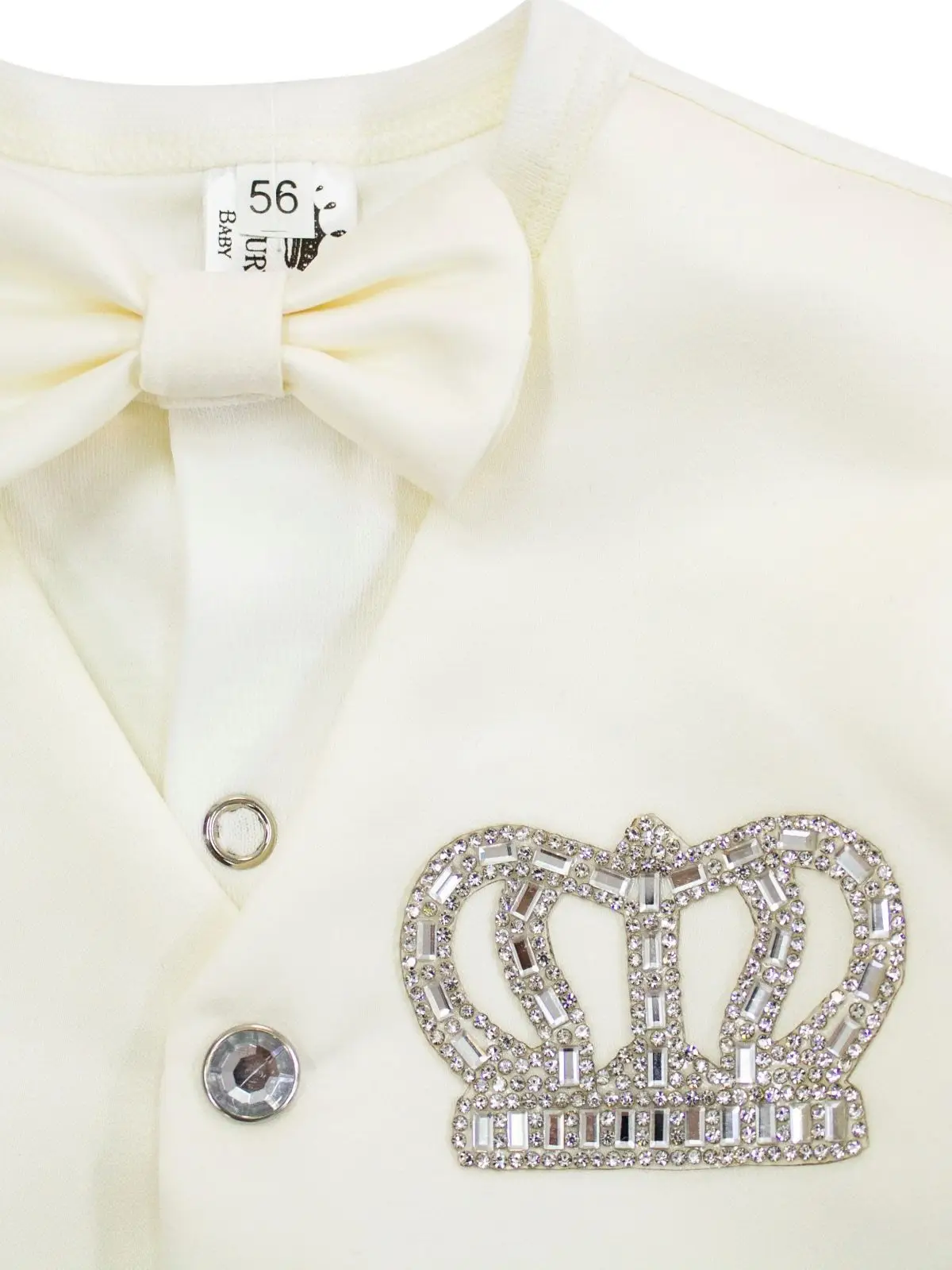 Комплект на выписку Luxury Baby Принц комбинезон с молочной жилеткой, бабочкой и стразами айвори 62