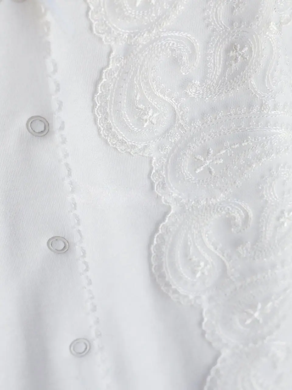 Комбинезон свободного кроя, застёгивается от воротничка до ножек на застёжки-кнопки. Спереди украшен необыкновенно красивой кружевной вставо...
