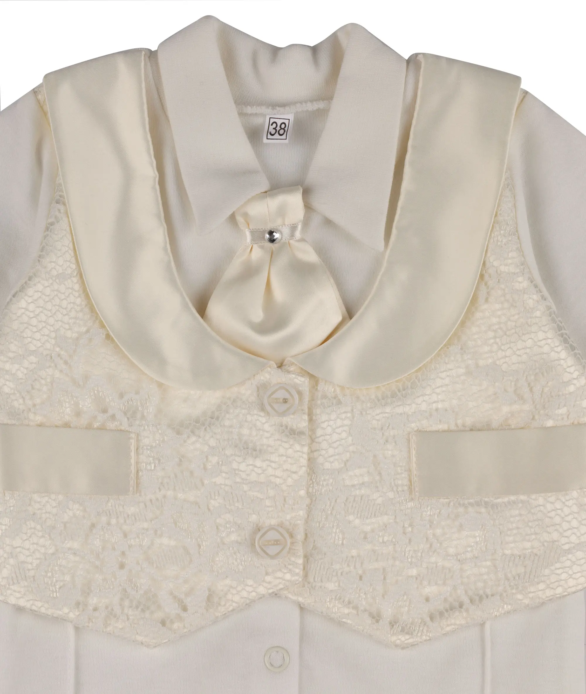 Спереди комбинезон оригинально декорирован вставочкой, имитирующей нарядный жилет с галстуком-бабочкой.