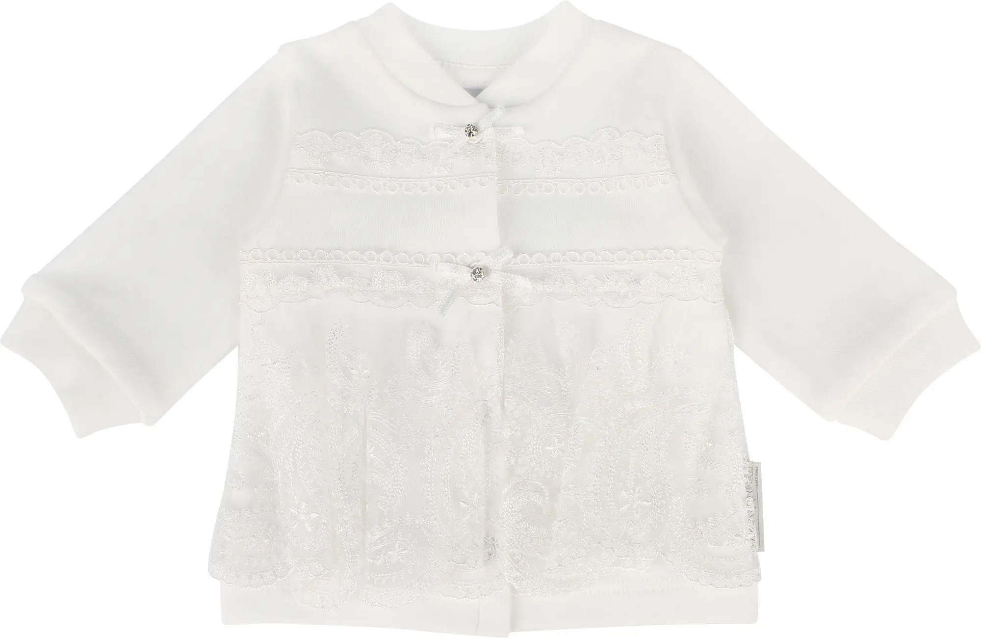 Белый ажурный комбинезон свободного кроя для маленькой принцессы застёгивается от воротничка до ножек на застёжки-кнопки. Спереди украшен не...