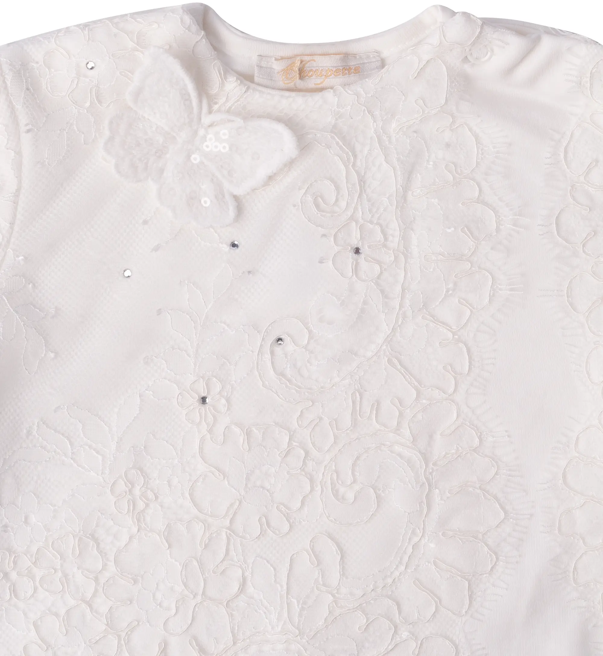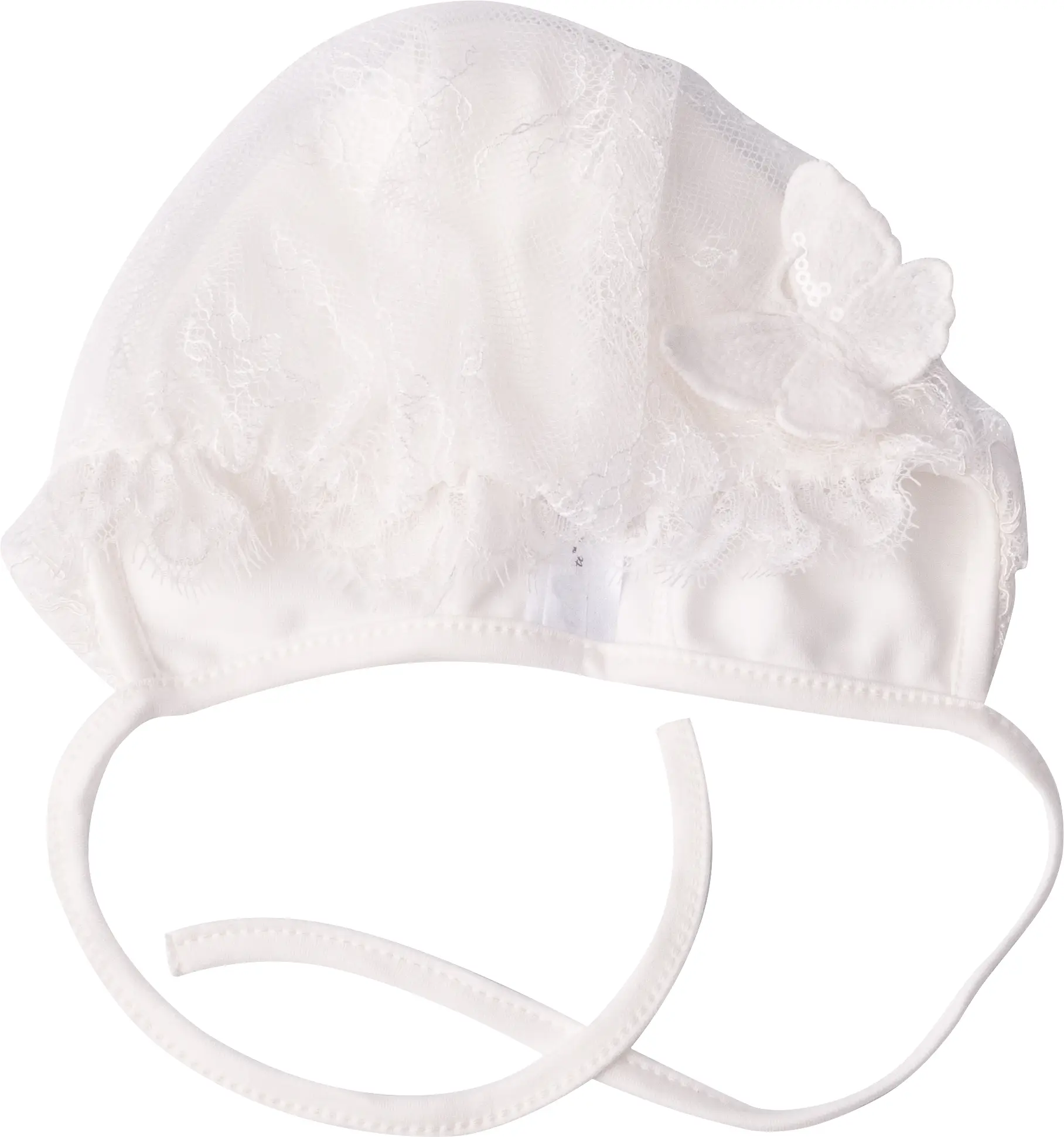 капюшон и верхняя часть изделия декорированы кружевом с нежными объёмными цветами