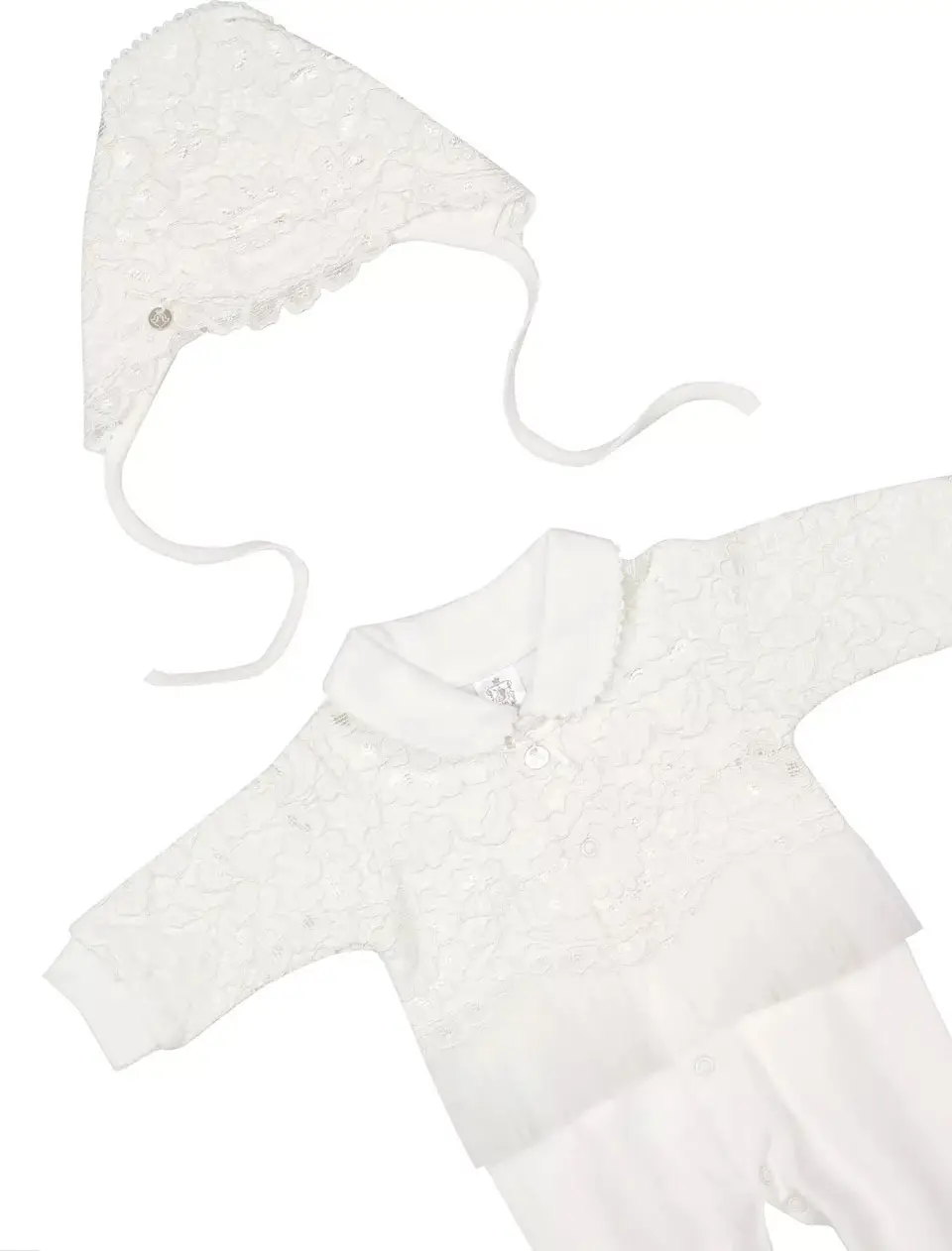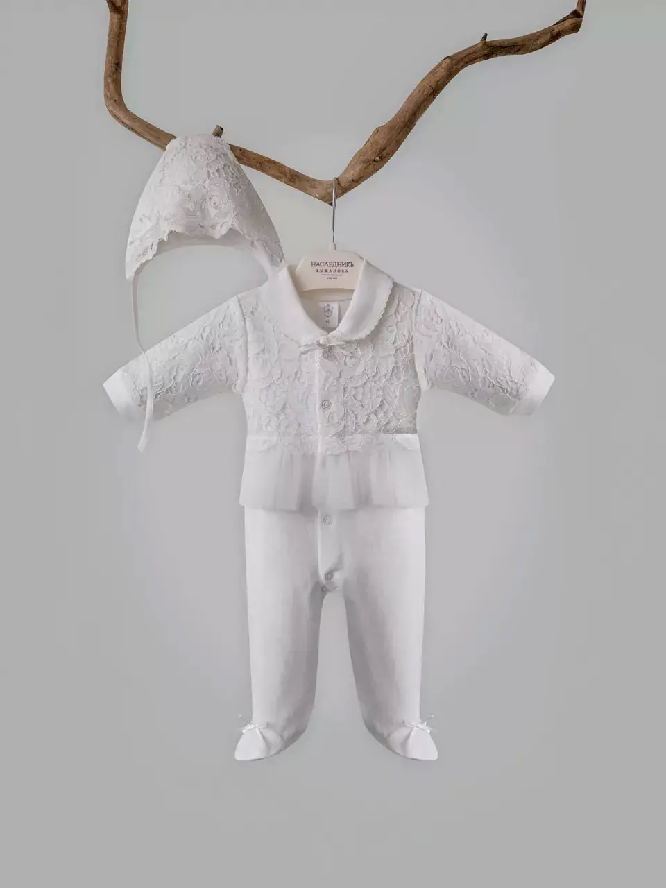 Комбинезон свободного кроя, застёгивается от воротничка до ножек на застёжки-кнопки. Спереди украшен необыкновенно красивой кружевной вставо...