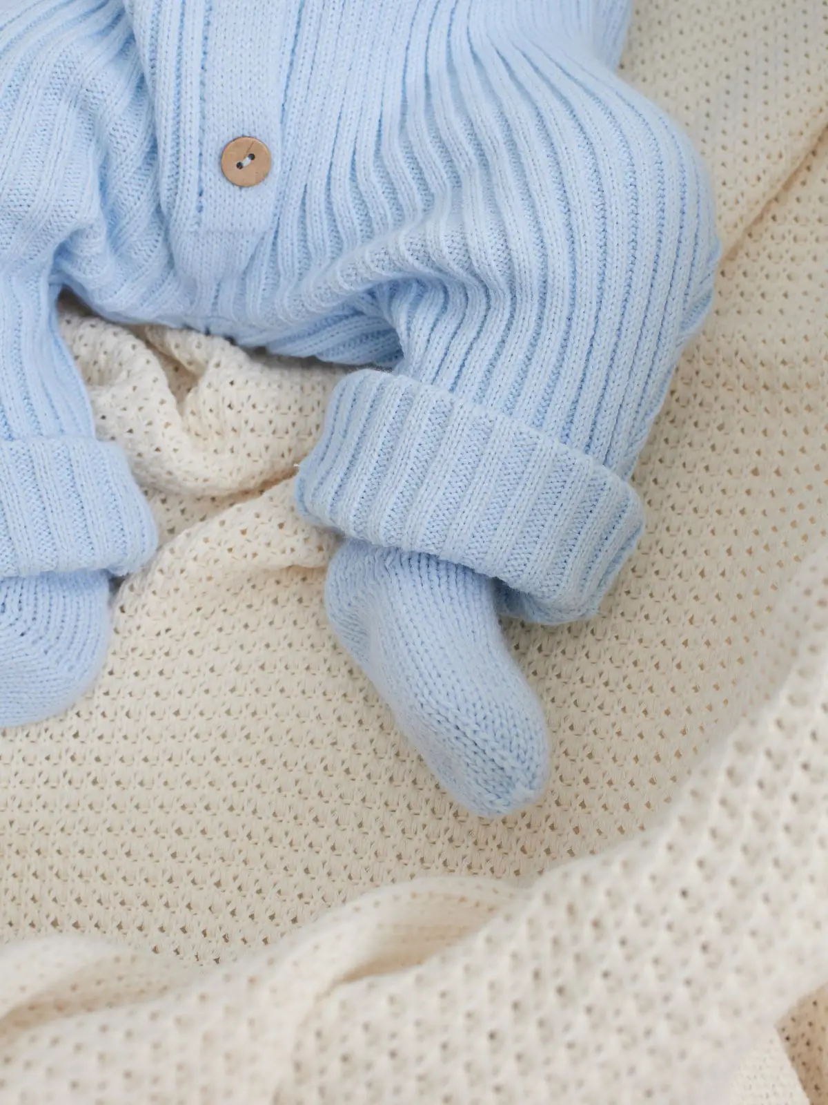Большой процент хлопка в составе комплекта придаёт изделию мягкую структуру и обладает дышащими свойствами. Пуговицы комбинезона выполнены из дерева, края отшлифованы и безопасны для ребёнка. Вязаную одежду рекомендовано стирать при низких температурах, на малых оборотах.