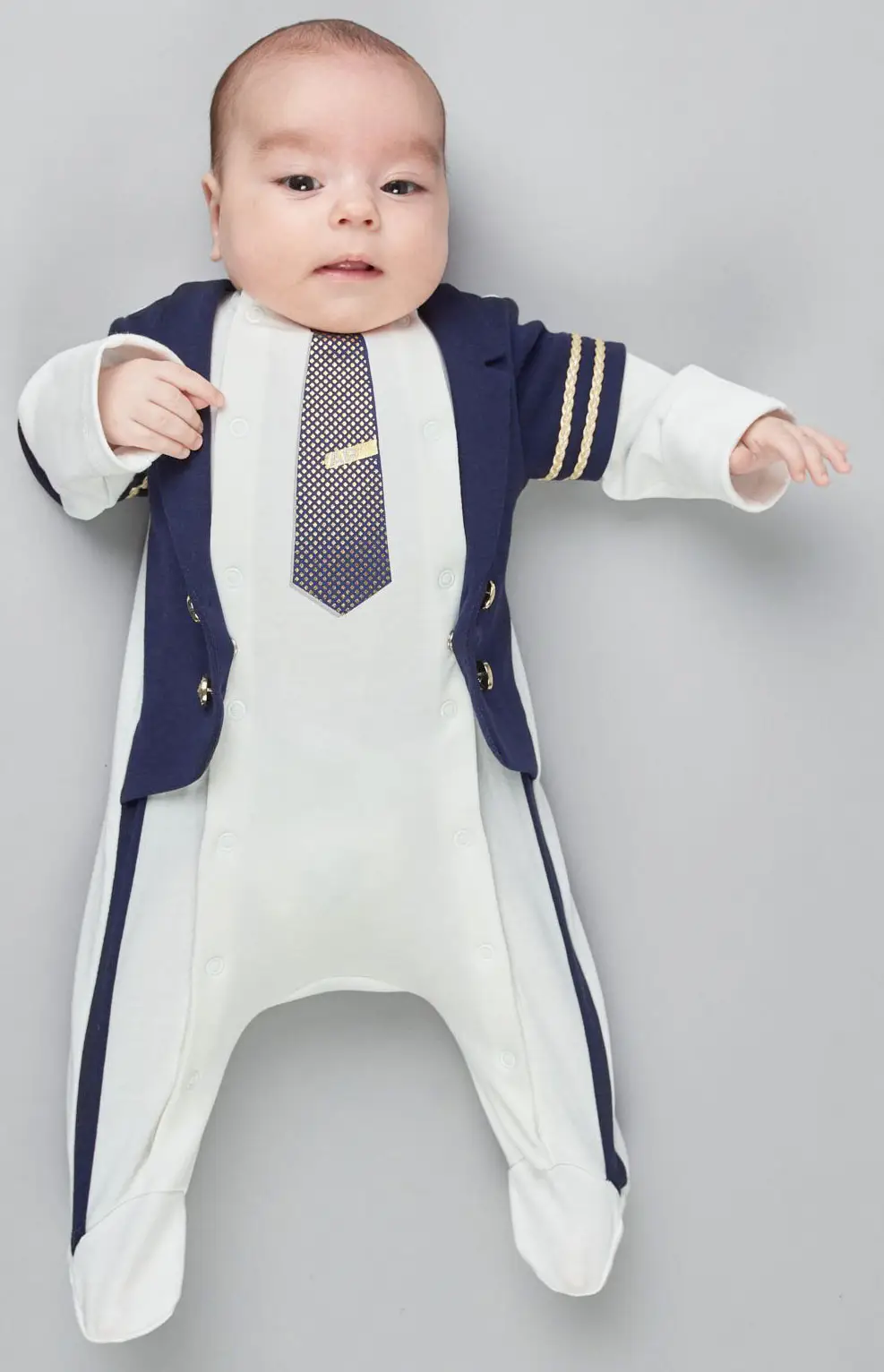 Украшен синим фраком с пуговицами, придающим комбинезону элегантный стиль и неповторимый образ вашему малышу.