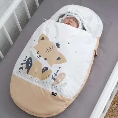 Демисезонный комплект на выписку KiDi kids включает в себя непродуваемый конверт с принтом лисёнка, который утеплён мягким наполнителем.