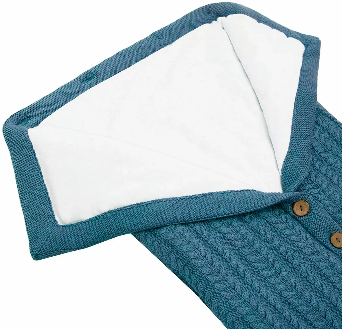 Внутренний подклад – 100% хлопок, конверт утеплен слоем из термофайбера 100гр/кВ.м. Благодаря удобной застёжке по всей длине, конверт легко раскрывается и удобен в использовании даже для самых маленьких деток. Капюшон конверта может быть отрегулирован по глубине с помощью пуговиц или раскрыт полностью. Вязаный конверт будет стильным, нарядным вариантом для выписки из роддома и отлично подойдёт для прогулок в коляску.