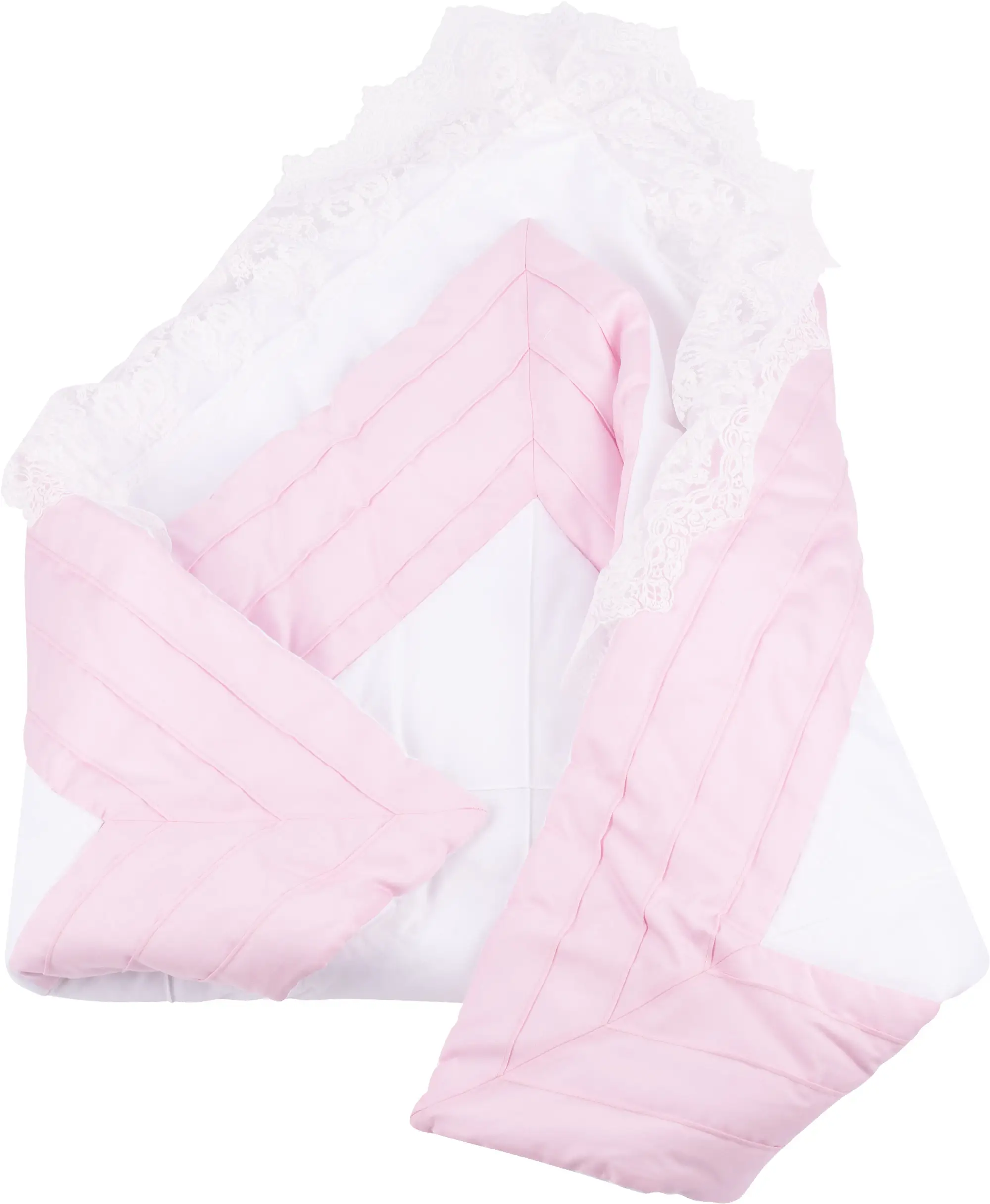 Элегантный конверт на выписку выполнен в нежных цветах из приятной сатиновой ткани и декорирован с ажурными кружевными вставками. На передне...