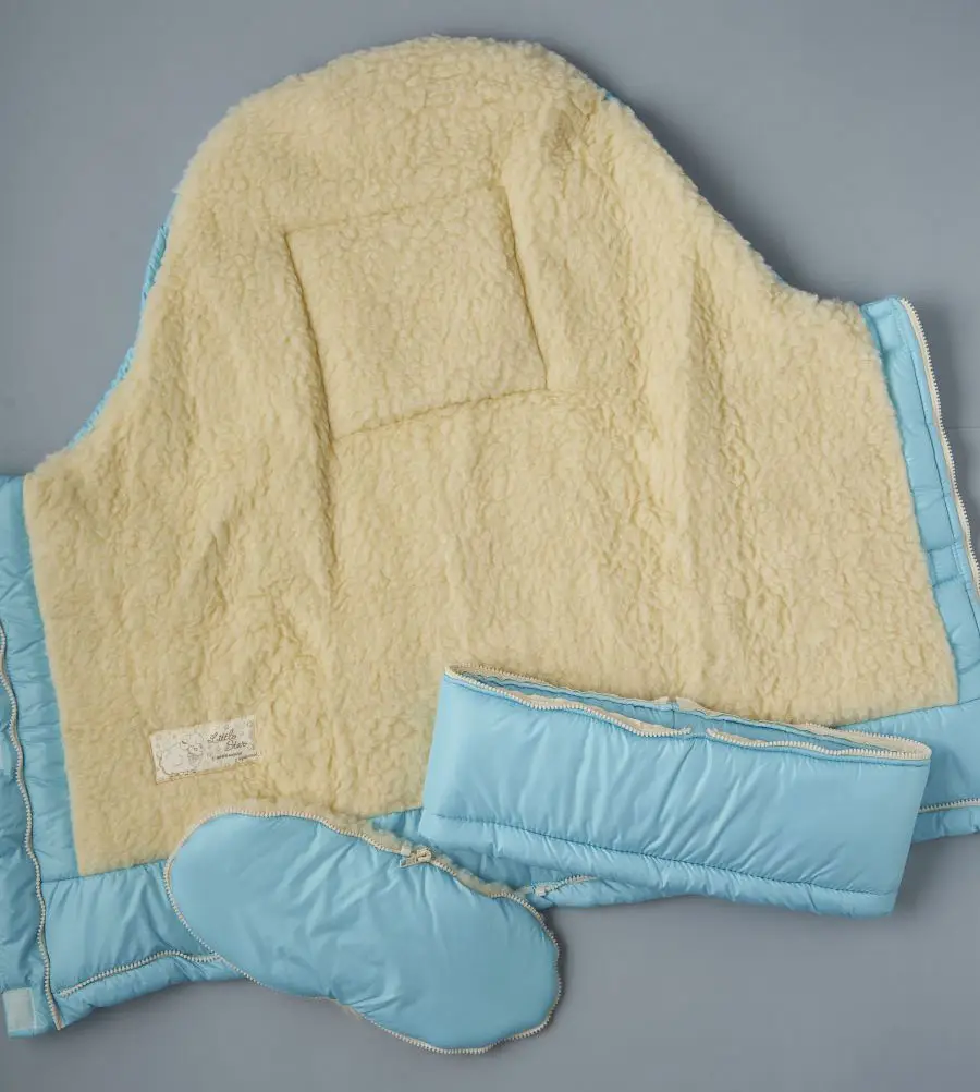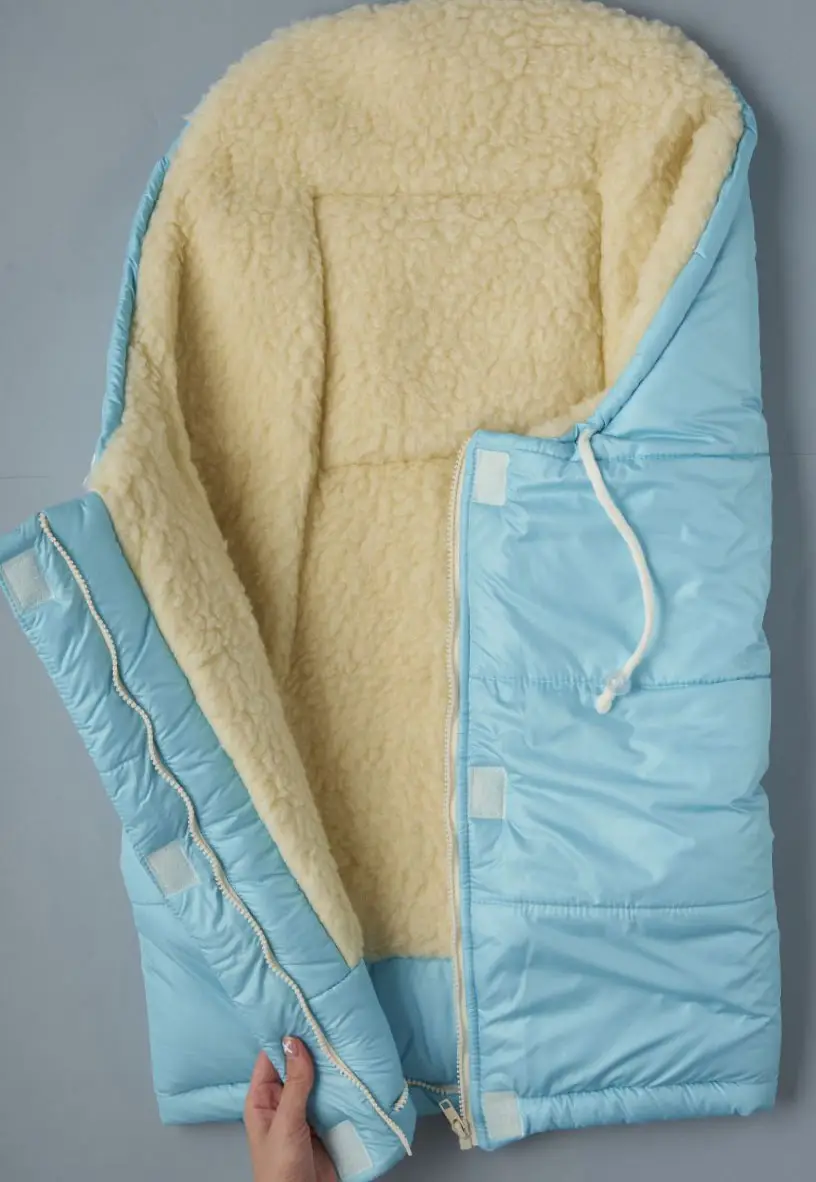 В качестве утеплителя использован мех мериноса на трикотажной основе, а верхнее покрытие выполнено из плащевки, которая защитит от влаги и ветра. Конверт имеет молнию посередине, а также дополнительную часть (20см шириной), благодаря которой можно увеличить конверт в ножках и гулять в нем еще больше.