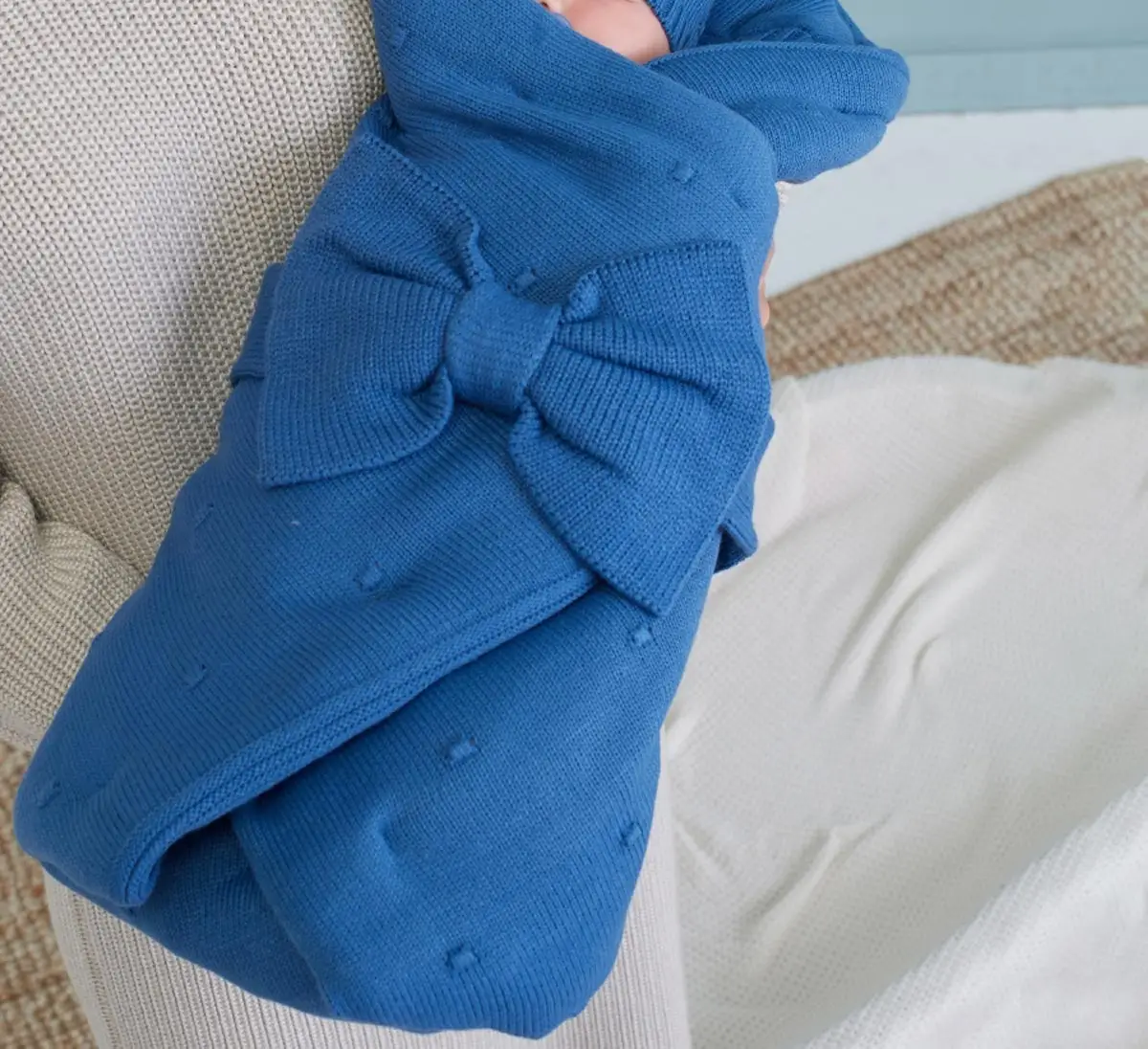 Тёплый и уютный вязаный конверт на выписку от Luxury Baby состотит из пледа для малыша и вязаного пояса с бантом.