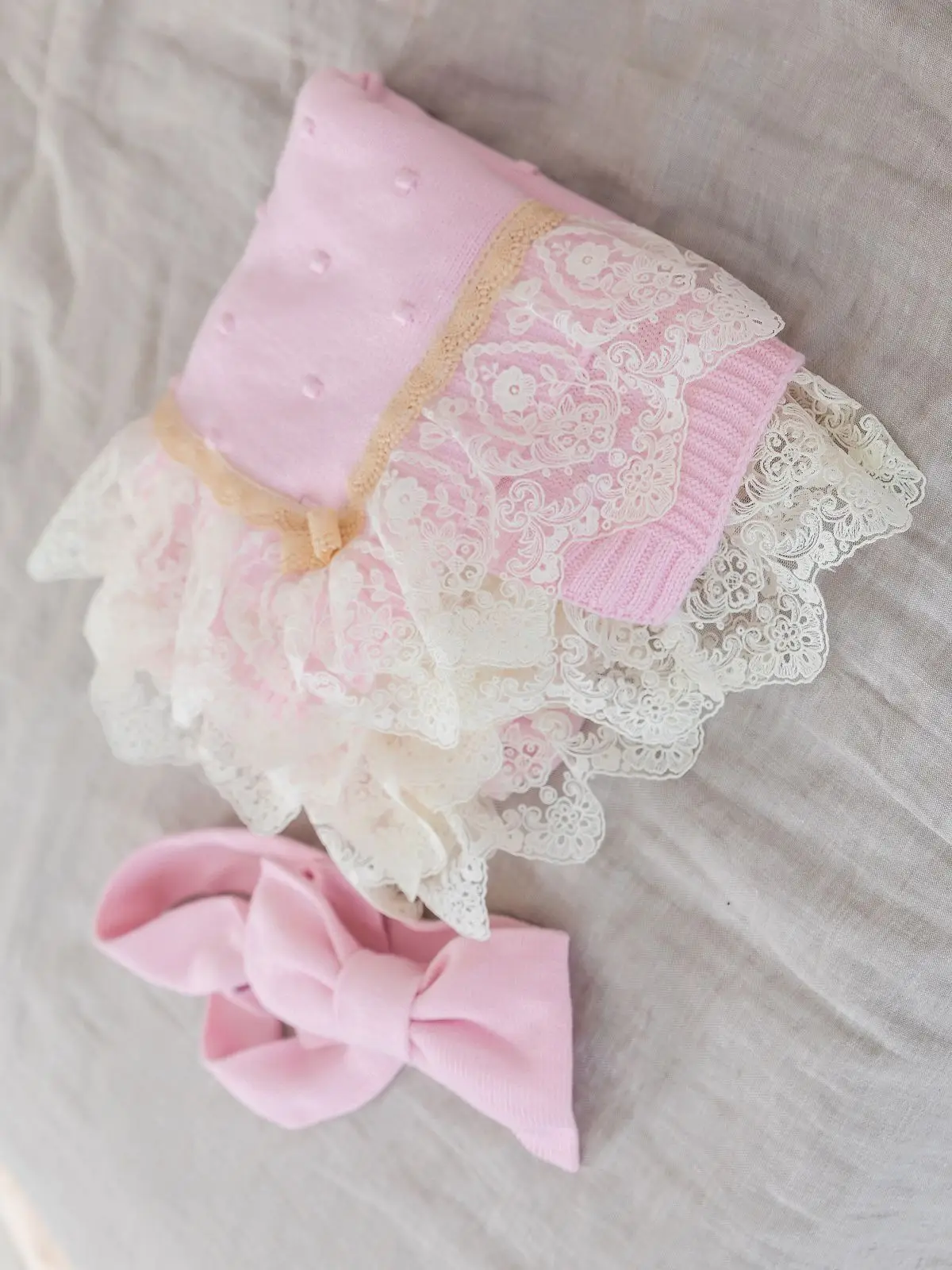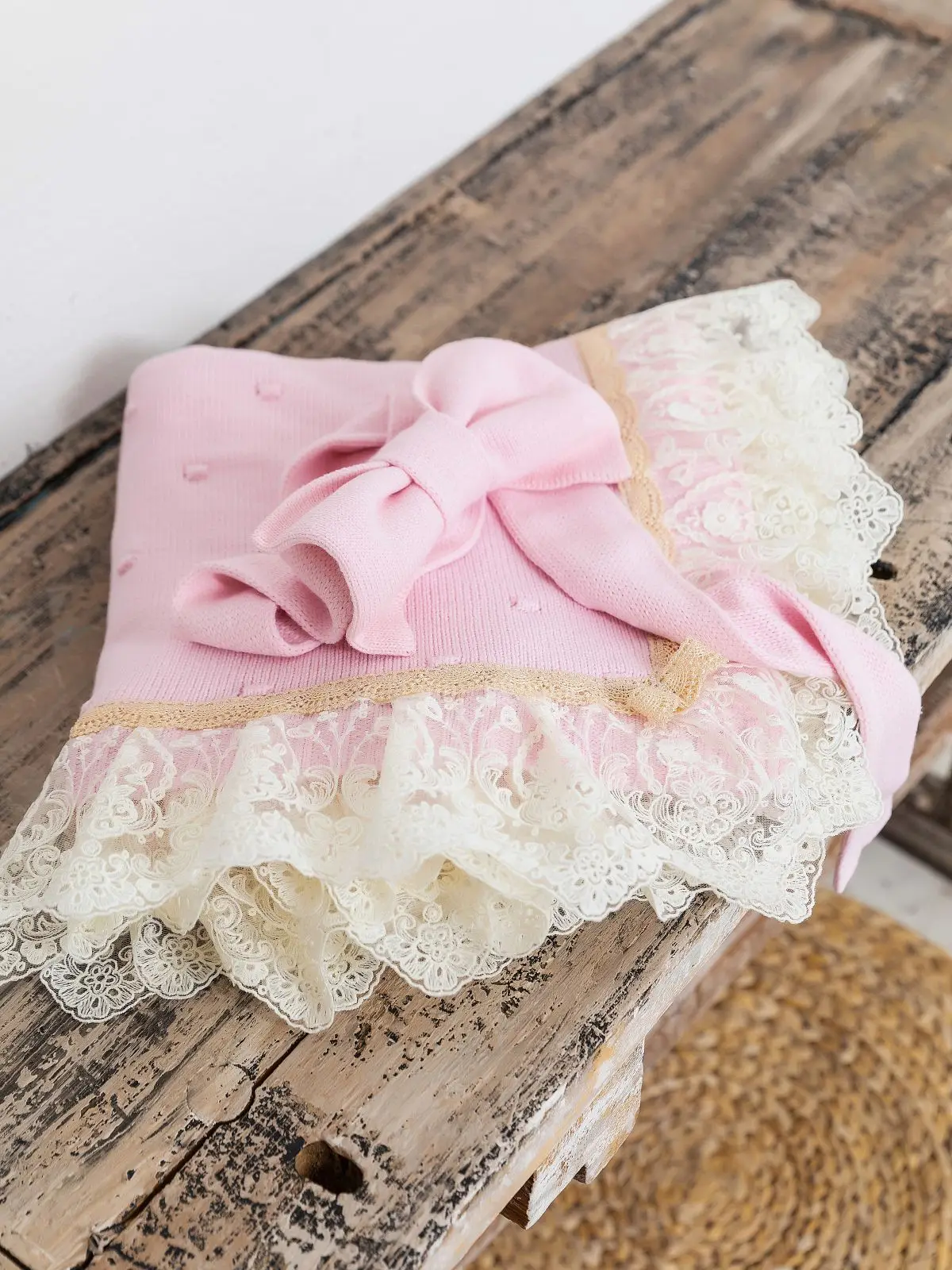 Вязаный комплект Luxury Baby Плед и бант с кружевом по периметру розовый 56-62