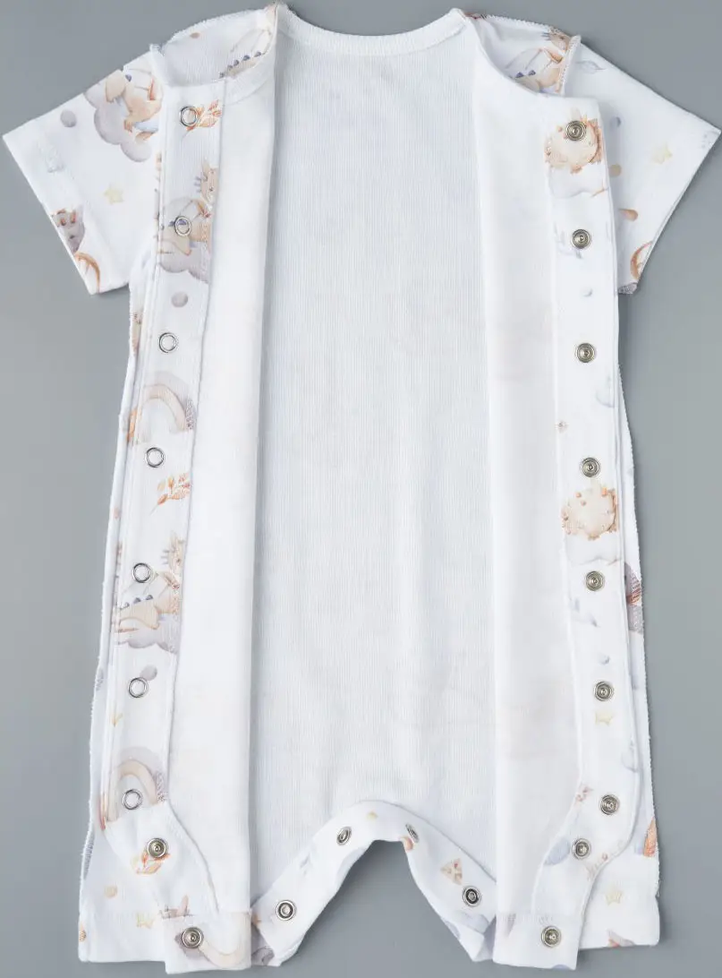 Песочник от Little Star с разноцветным принтом. Материал изготовили из хлопка, выращенного без использования химикатов, поэтому он получился гипоаллергенным и особенно нежным. Для комфортного и быстрого переодевания малыша кнопки расположены по центру и по ножкам.
