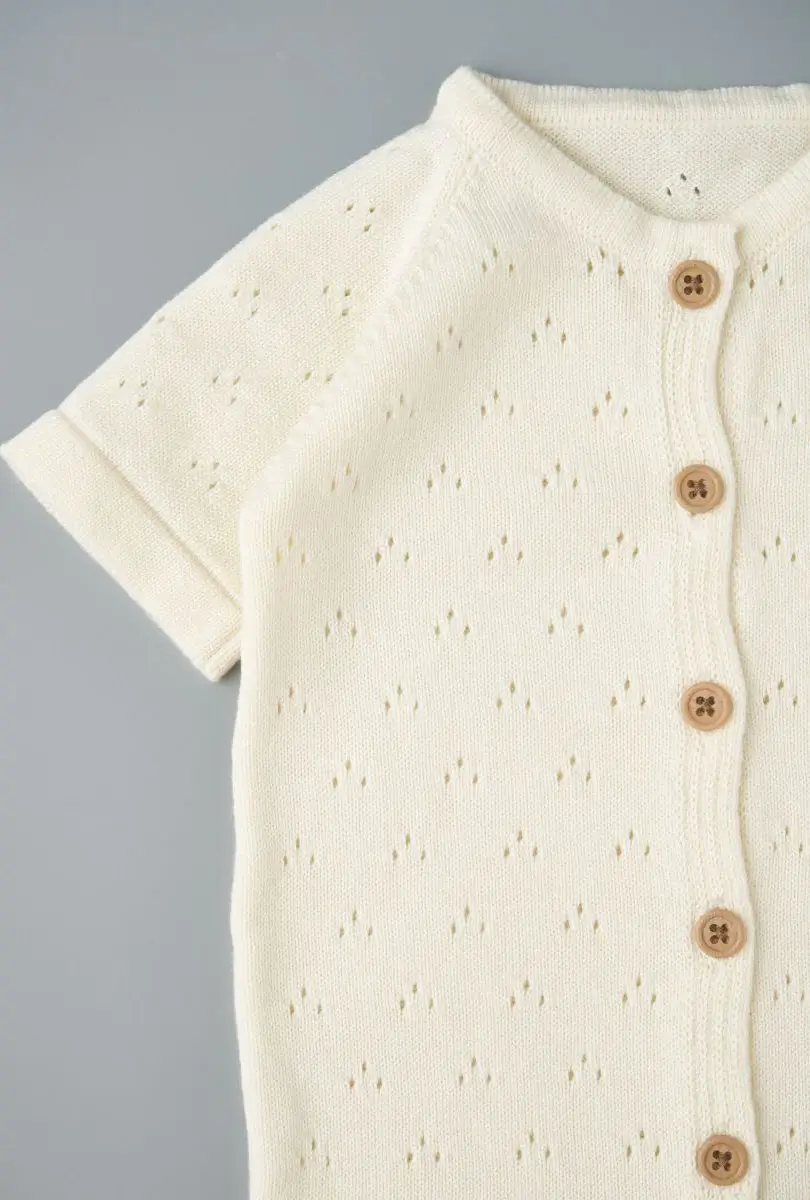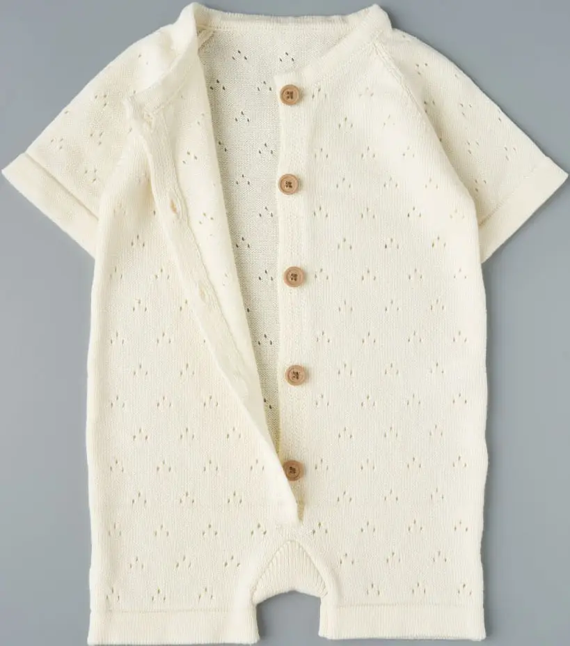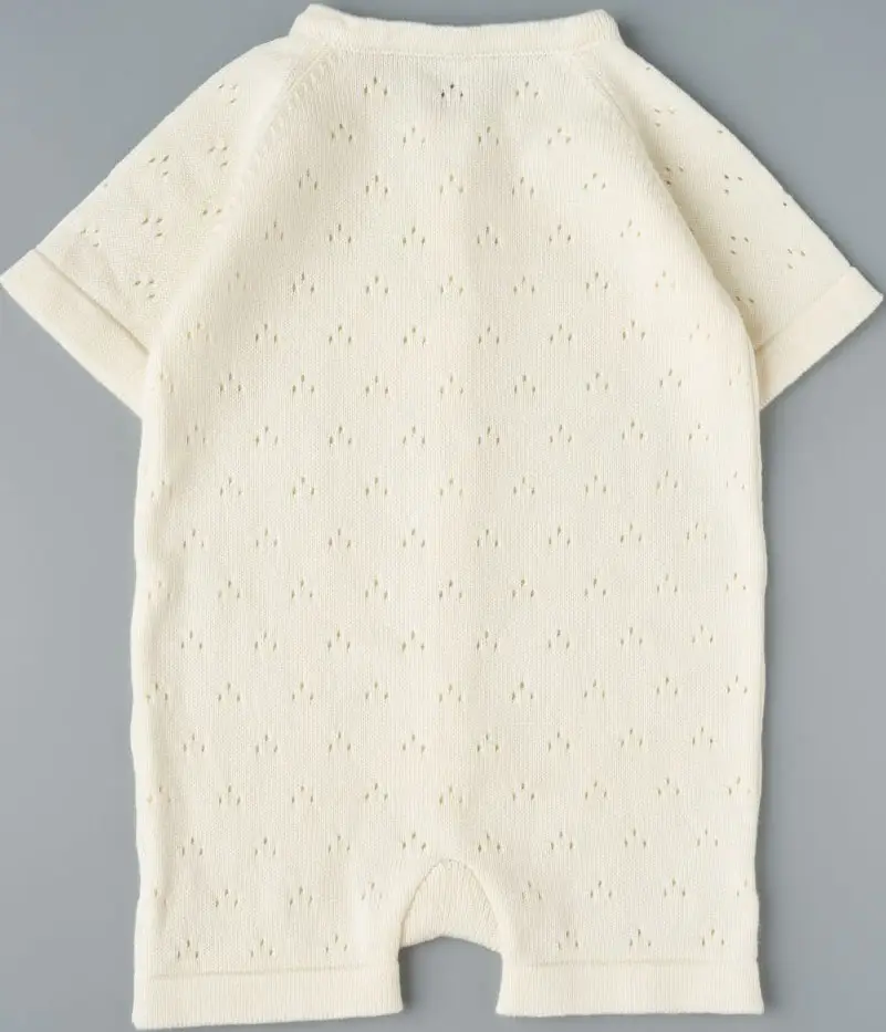 Универсальный песочник от Little Star с коротким рукавом с невероятного нежным и стильным ажурным узором имеет классический приталенный крой. Пуговки расположены посередине.