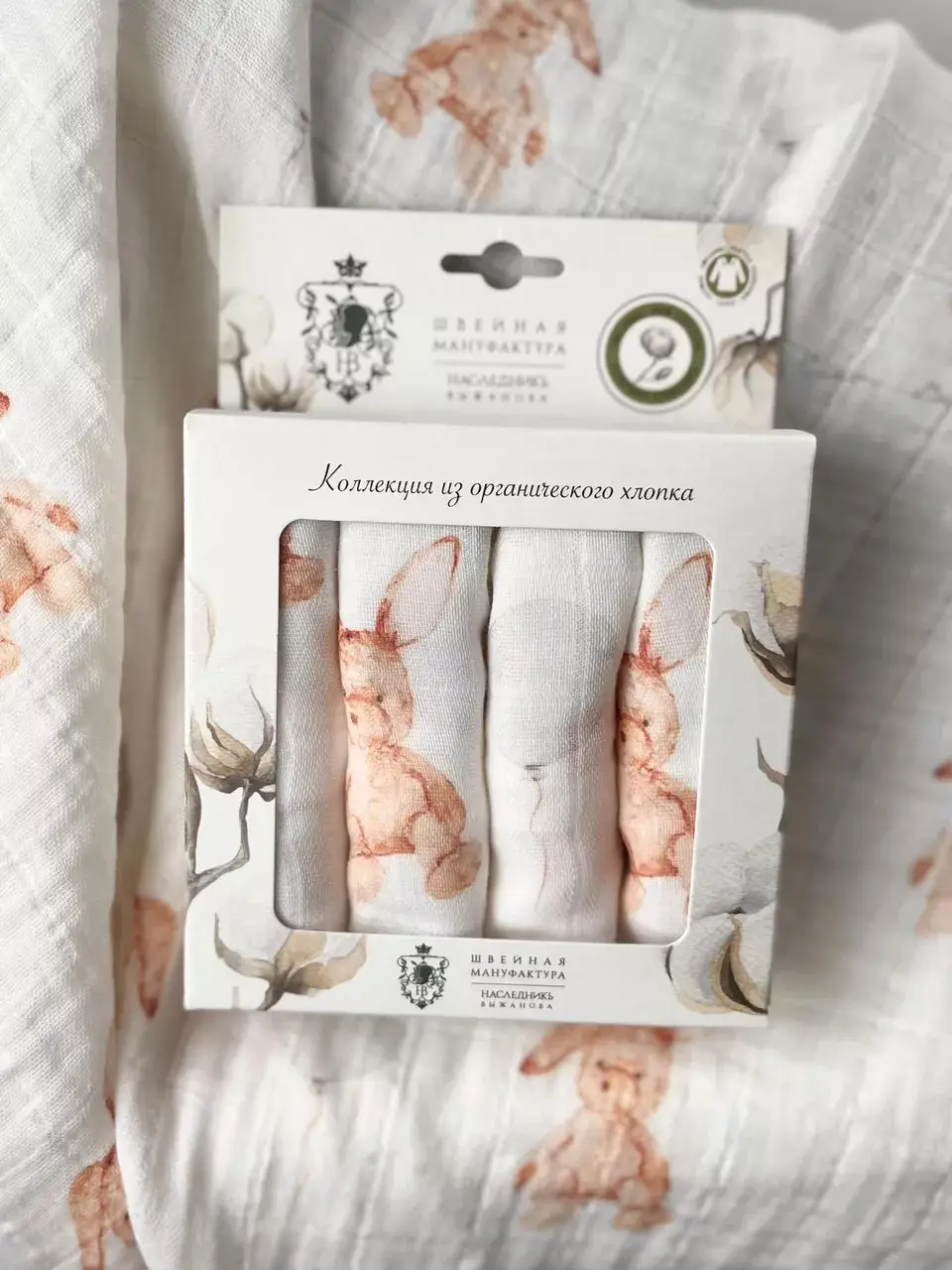 Платочки муслин Наследник Выжанова, 25х25 см, 4 шт, рисунок зайка
