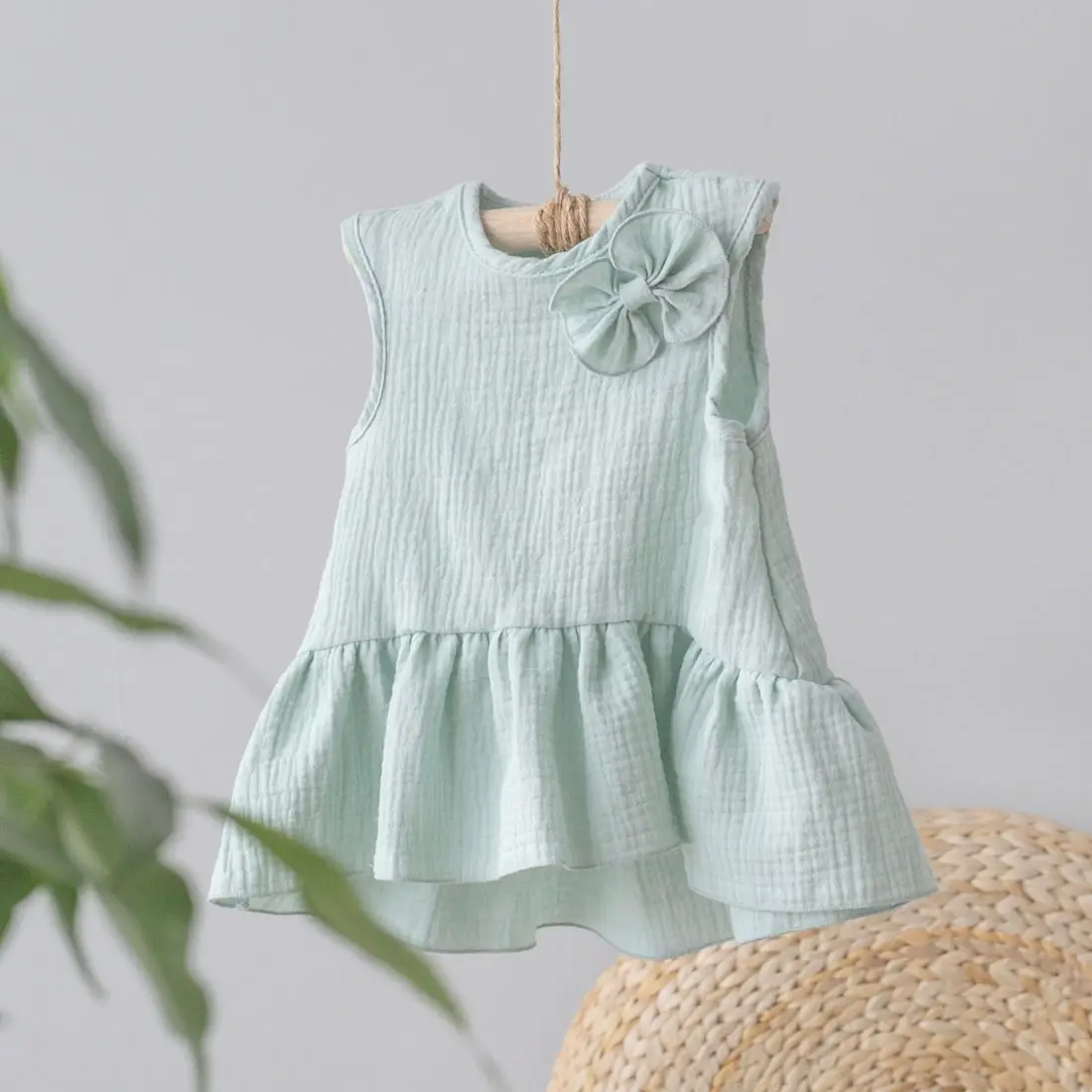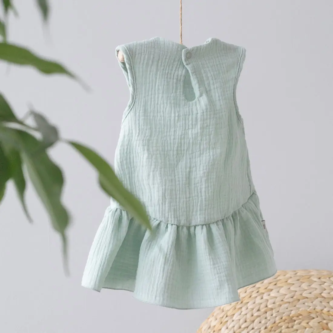 Летнее платье без рукавов заниженной линией талии изготовлено из лёгкого, невесомого материала. По низу платья идет волан, удлиненный сзади. Муслиновая одежда отличный вариант для прогулок, похода на пляж и игр на детской площадке. Ткань практична, не линяет, не садится, хорошо переносит стирку и не требует глажки.