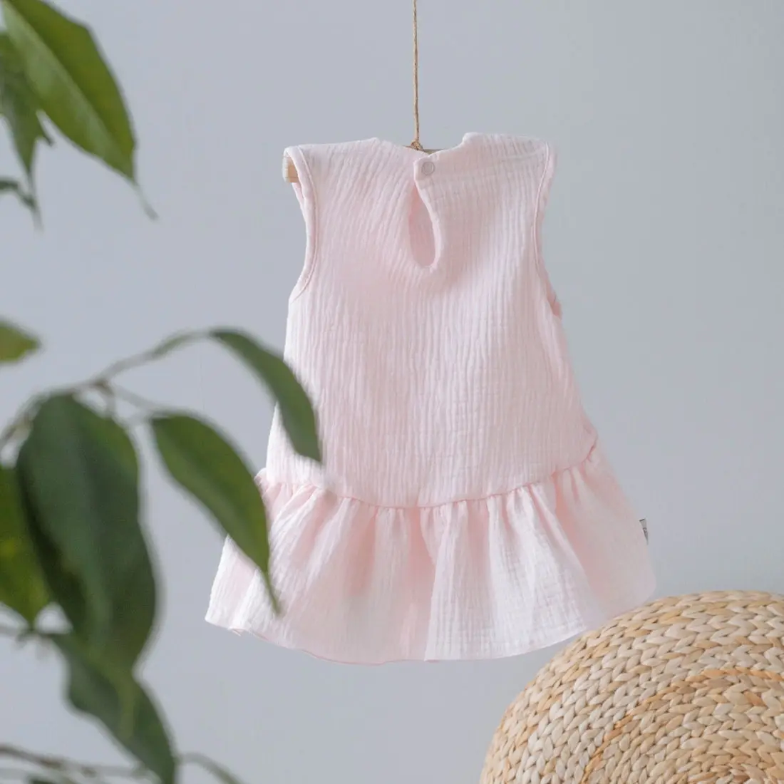 Летнее платье без рукавов заниженной линией талии изготовлено из лёгкого, невесомого материала. По низу платья идет волан, удлиненный сзади. Муслиновая одежда отличный вариант для прогулок, похода на пляж и игр на детской площадке. Ткань практична, не линяет, не садится, хорошо переносит стирку и не требует глажки.