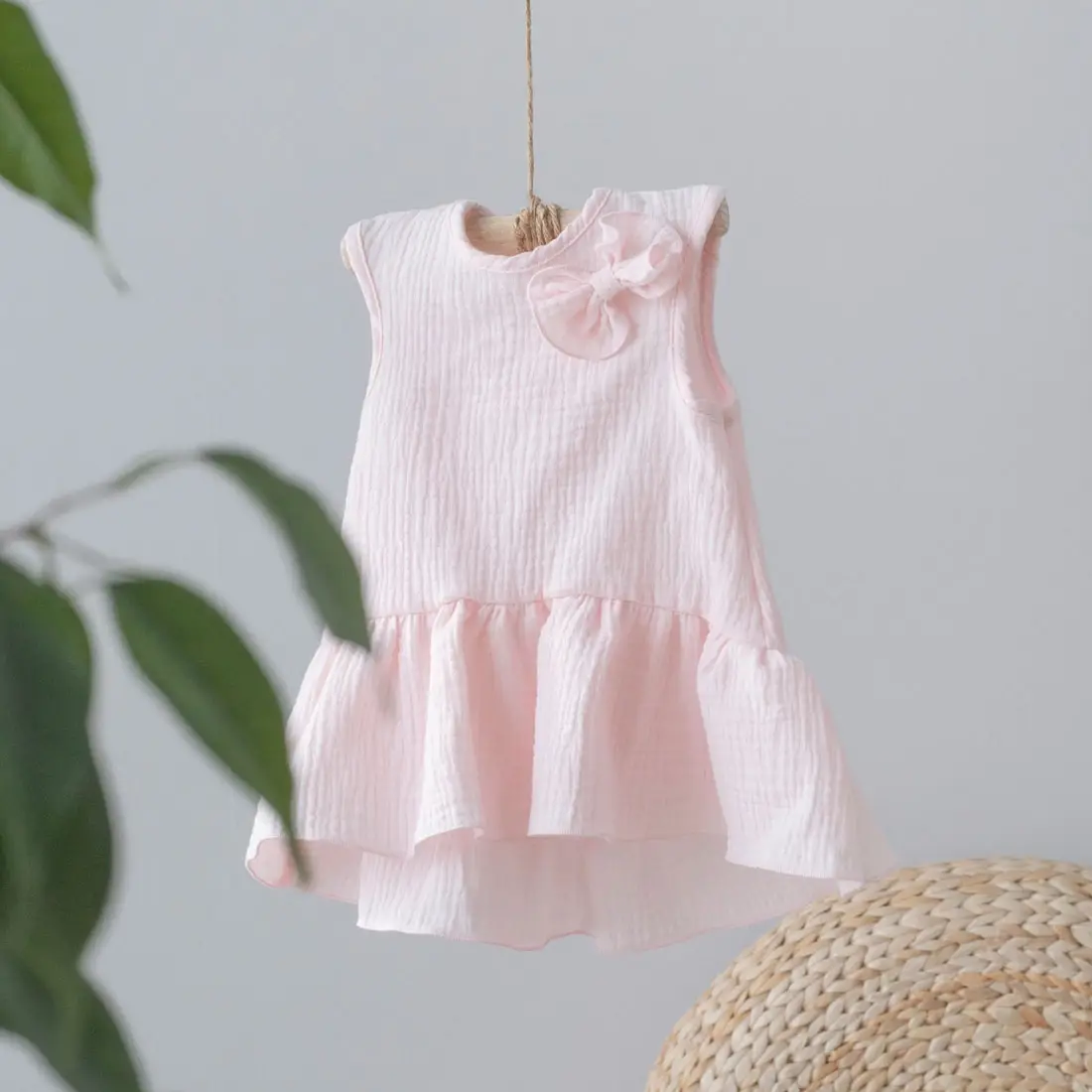 Летнее платье без рукавов заниженной линией талии изготовлено из лёгкого, невесомого материала. По низу платья идет волан, удлиненный сзади. Муслиновая одежда отличный вариант для прогулок, похода на пляж и игр на детской площадке. Ткань практична, не линяет, не садится, хорошо переносит стирку и не требует глажки.