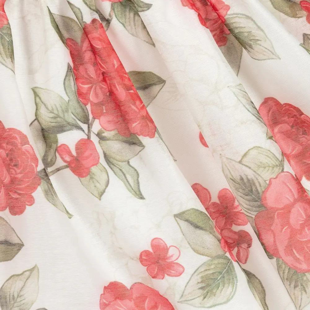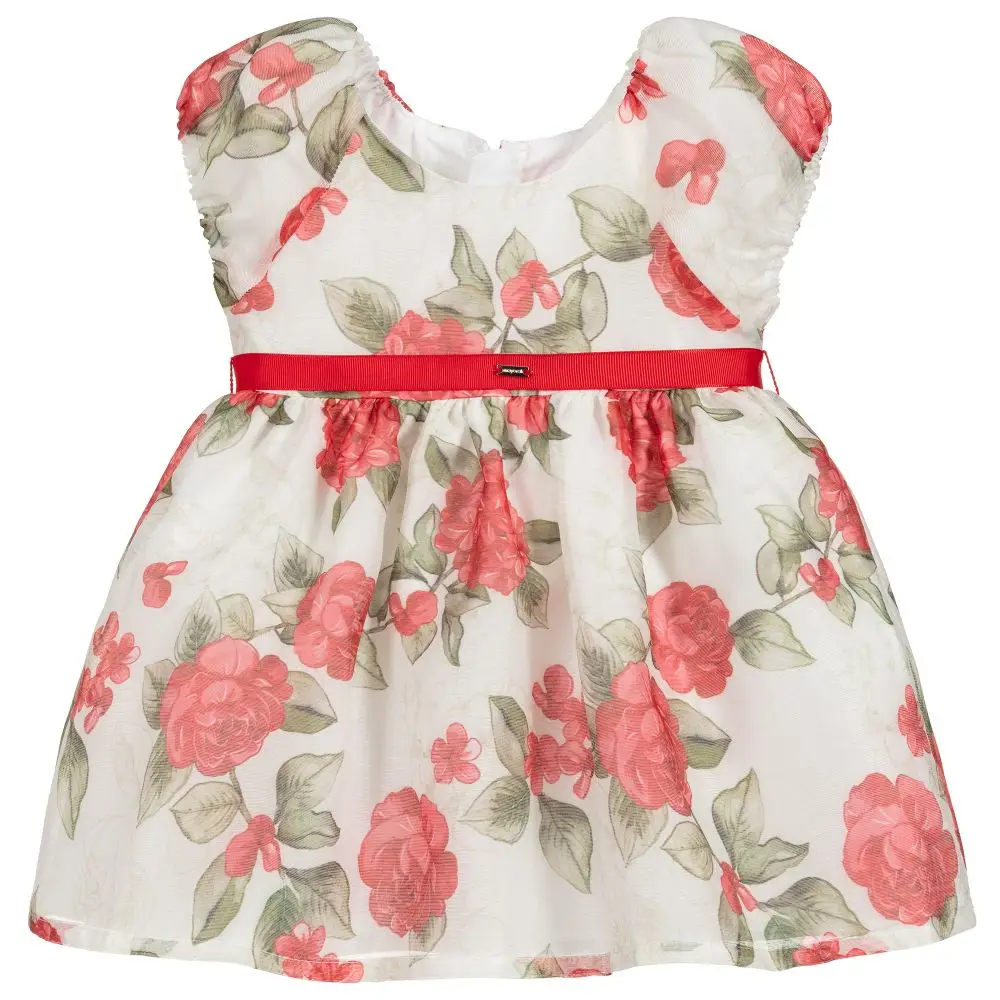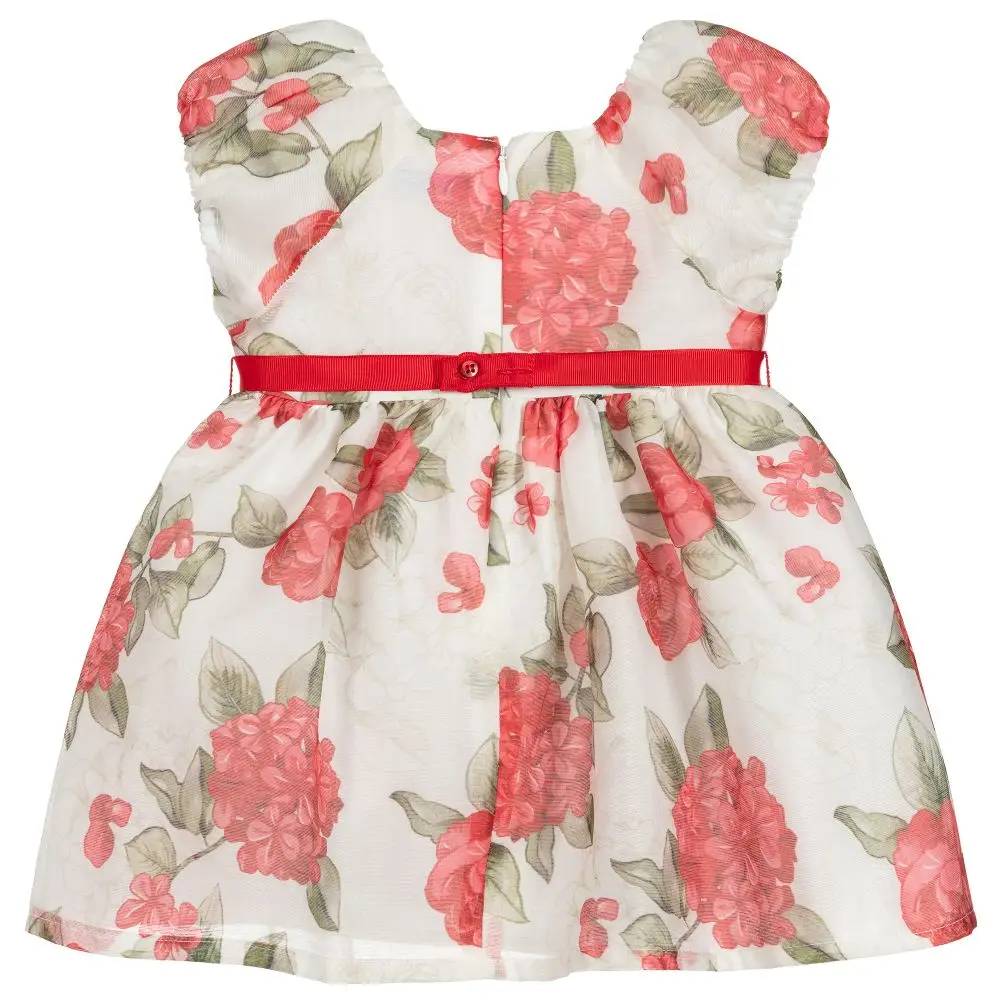 Детское платье цвета слоновой кости от Mayoral с красно-зелёным цветочным узором и воздушными рукавами. Плате на высокой талии, которую укр...