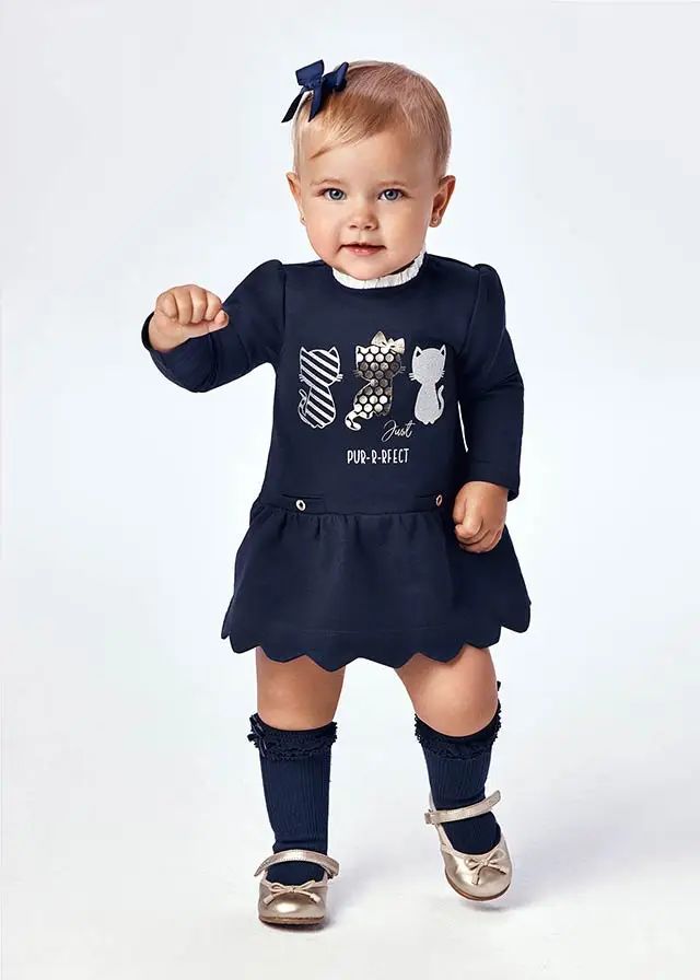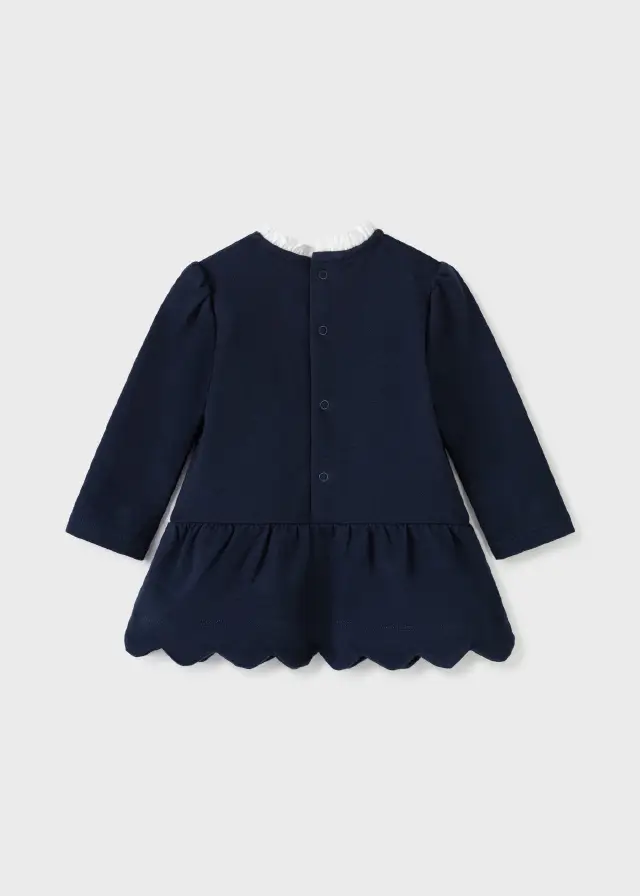 Платье с длинными рукавами для девочки. Воротник с круглым вырезом и контрастными деталями. Модель с заниженной талией. Удобная застёжка-кнопка на спине. Модель с волнистыми оборками по краю изделия.