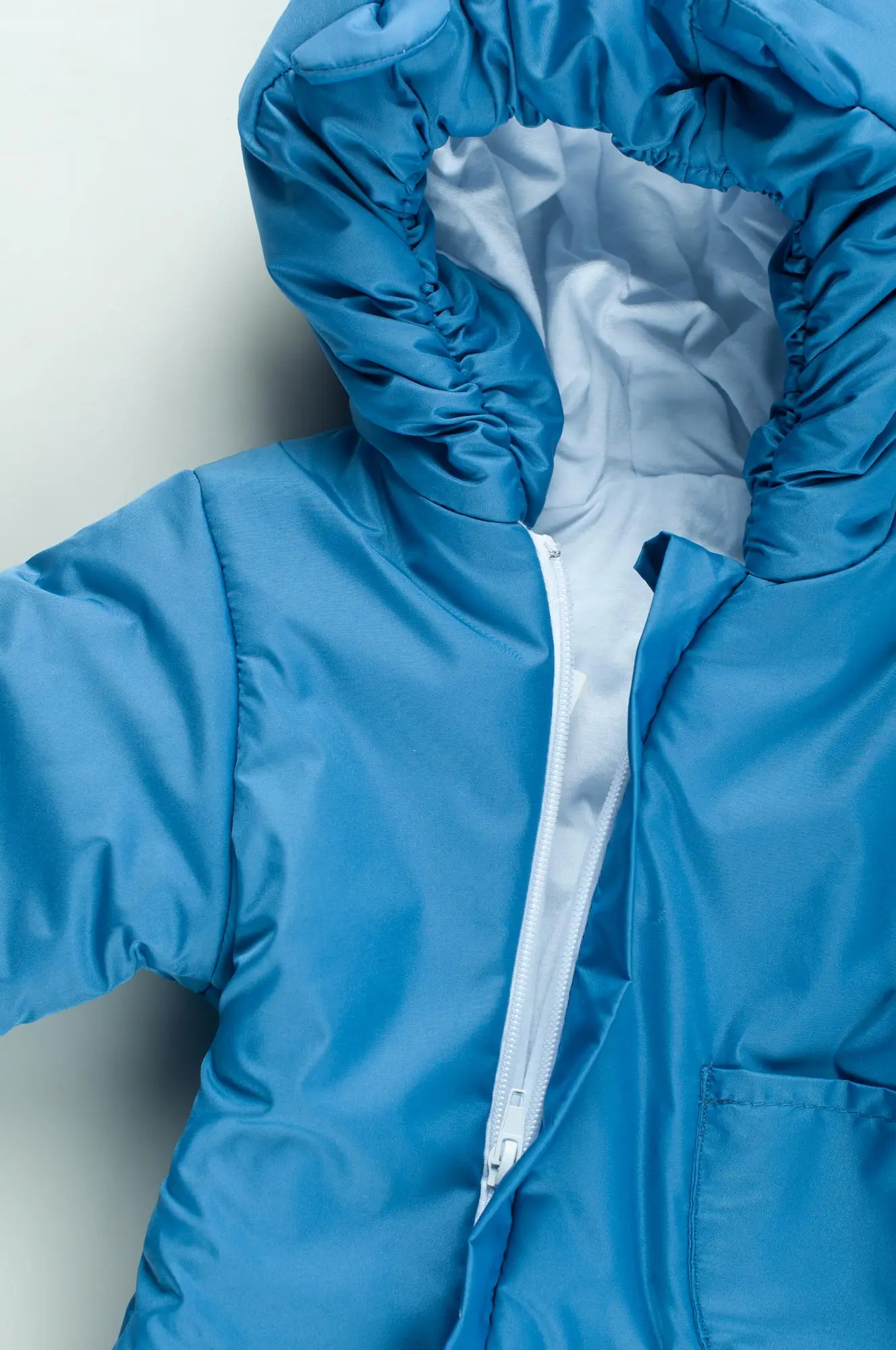 Капюшон со вшитой резинкой плотно прилегает к голове, защищая лицо малыша от ветра.
