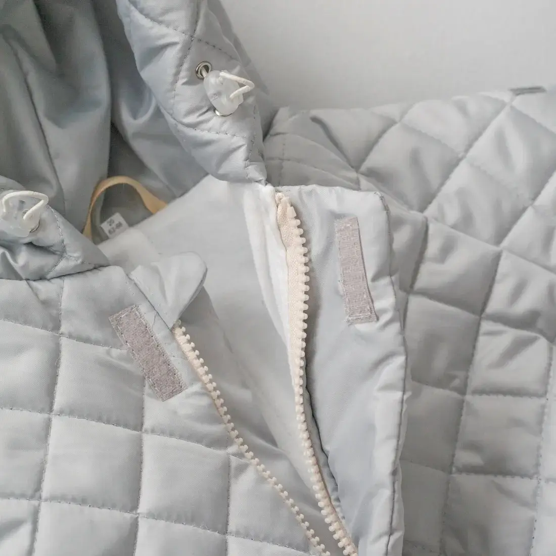 Комбинезон с капюшоном с подкладом из трикотажа кулир и тафетты. Молния на всю длину. На горловине молния закрыта клапаном для защиты шеи малыша. На спинке на поясе утягивающая резинка. На ножках отстегивающая селиконовая регулирующая резинка для сапожек на пуговках.
