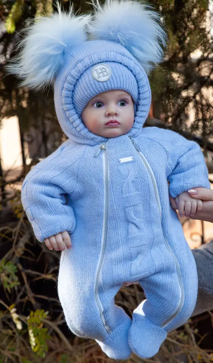 Комбинезон Наследник Выжанова с капюшоном и помпонами изготовлен из шерсти мериноса и кашемира, подкладка – из 100% хлопка, утеплитель – термофин. Идеален для холодной погоды.