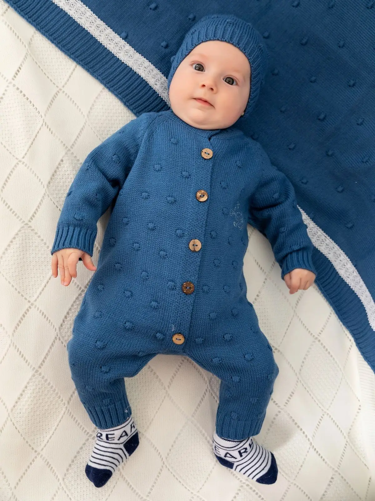 Вязаный комплект Комбинезон и шапочка Luxury Baby синий 56-62