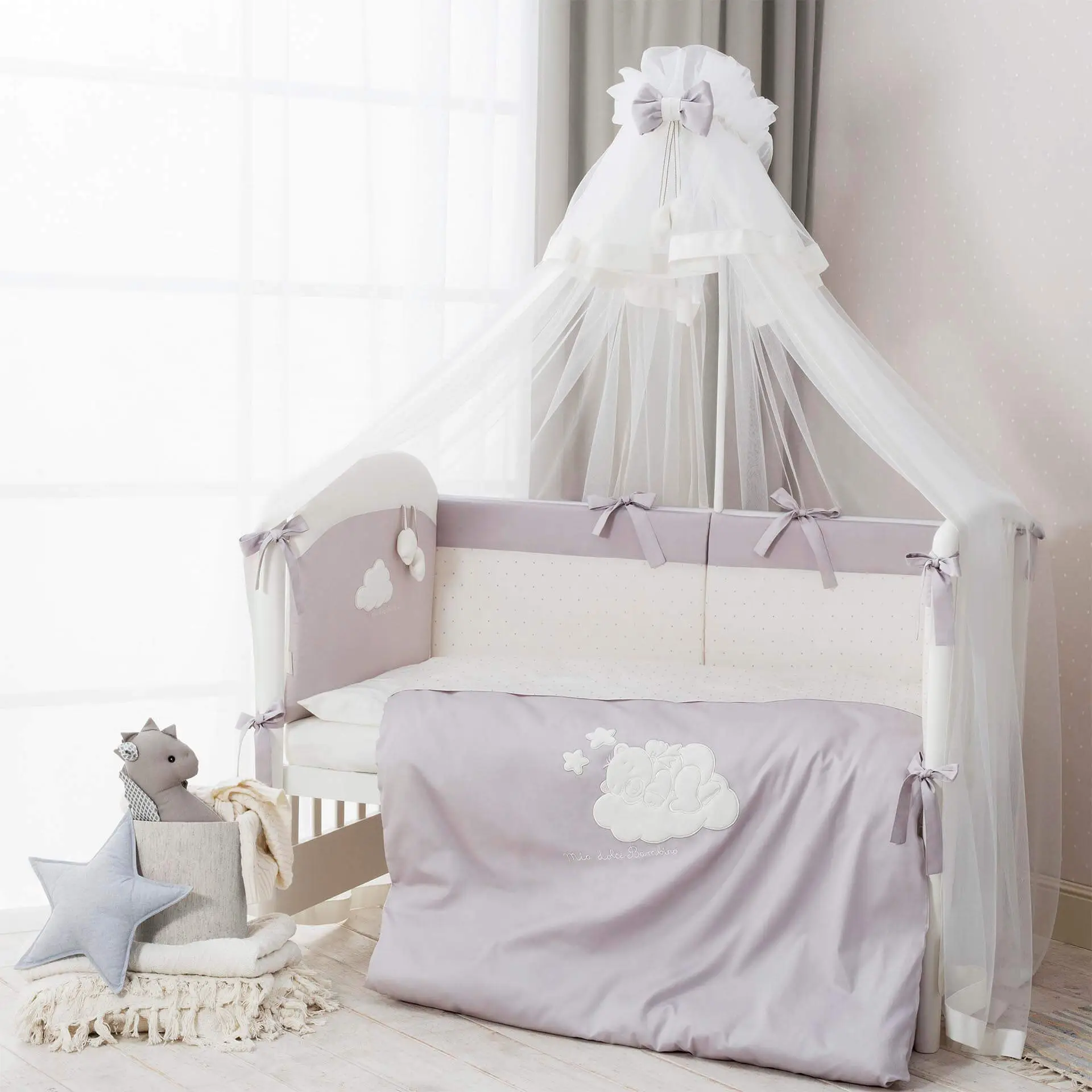 - за счёт своей длины 180 см и ширины 450 см полностью накрывает кроватку и защищает малыша от пыли и света;