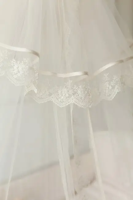 Выполнен из нежнейшего фатина, в сочетании с роскошным кружевом. Необычно выглядит вышитый шеврон в геральдических мотивах, украшающий верх...