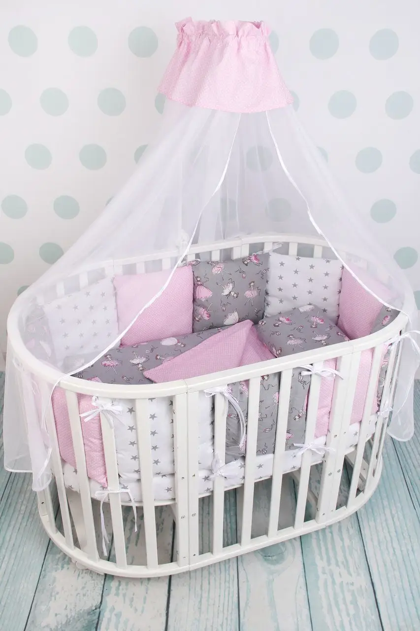 Такие бортики идеально подходят для любых кроваток прямоугольных, овальных, круглых с периметром стенок 360 см.