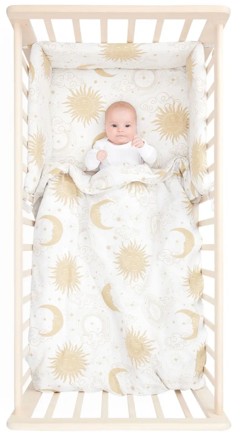 Мягкий и плоский бортик с безопасным плотным наполнителем защитит кроху от травм, ушибов и застревания в перегородках.