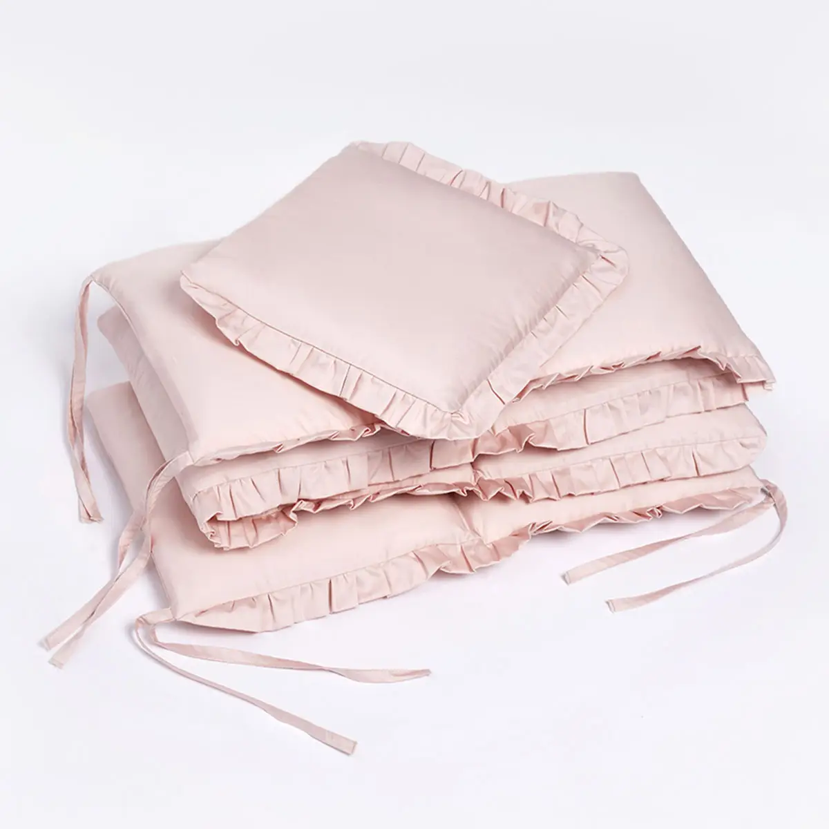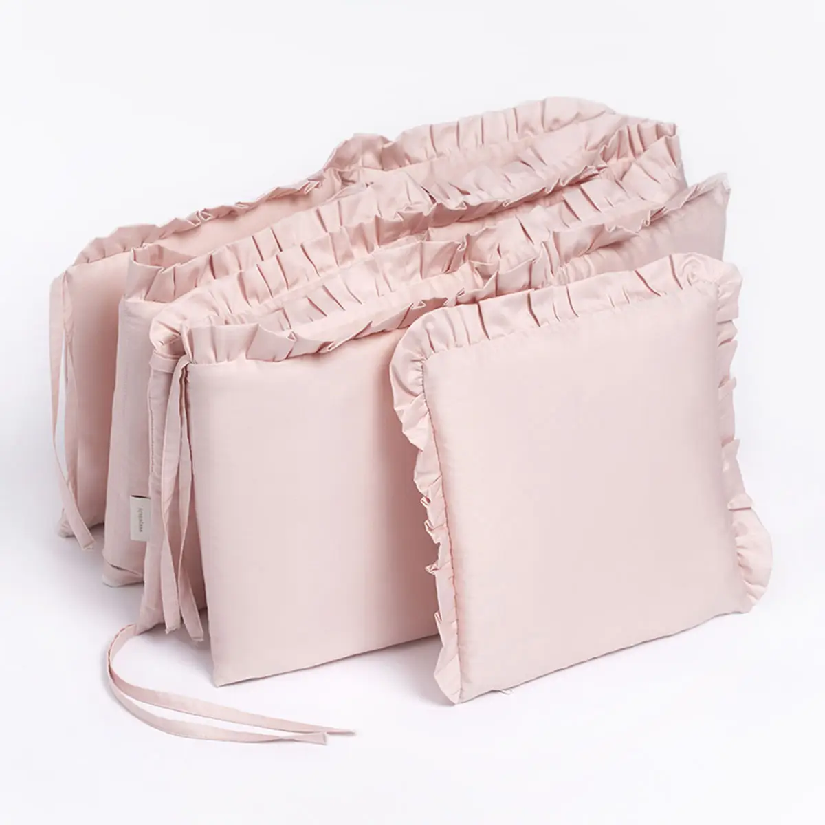 Для удобства использования бортики состоят из 4 частей – полуборт из 6 подушечек, одна отдельная и по одной части из 2 и 3 подушечек. Элементы крепятся к кроватке завязками. Вы можете ставить в кроватку столько частей, сколько захотите, а отдельную подушечку с рюшами можно использовать не только как защиту, но и как декоративный элемент.