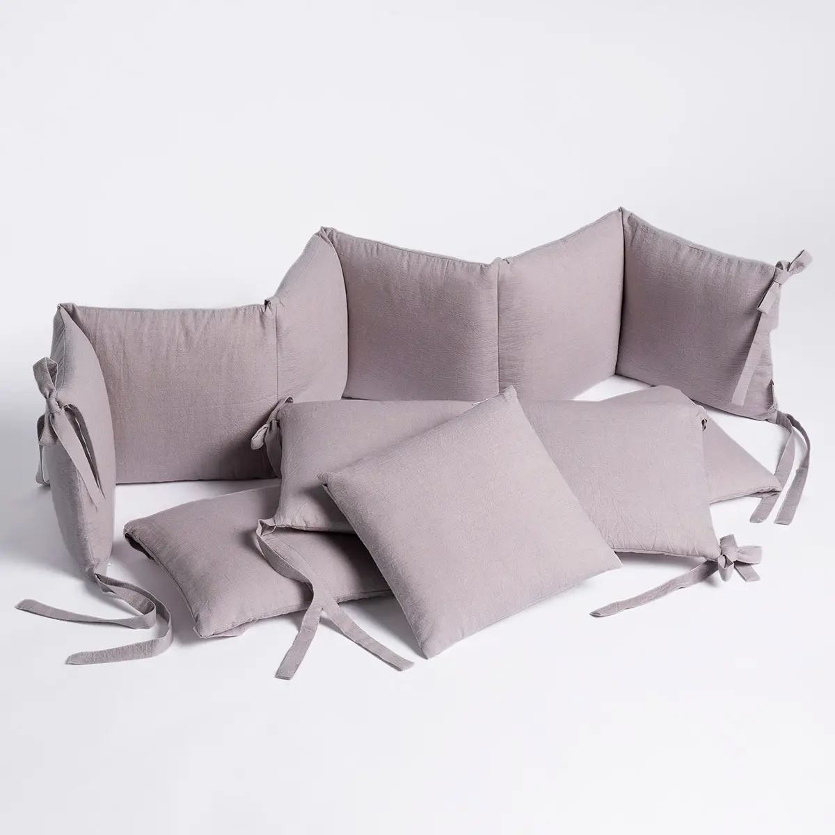 Чехлы из натурального хлопка Eco Soft Cotton. Это очень мягкая разновидность хлопка, который отлично пропускает воздух и долго остается как новый даже после многократных стирок. Его секрет в специальном способе создания узора без окрашивания. Для удобства использования бортики состоят из 4 частей – полуборт из 6 подушечек, одна отдельная и по одной части из 2 и 3 подушечек. Элементы крепятся к кроватке завязками. Вы можете ставить в кроватку столько частей, сколько захотите, а отдельную подушечку можно использовать не только как защиту, но и как отдельный элемент.